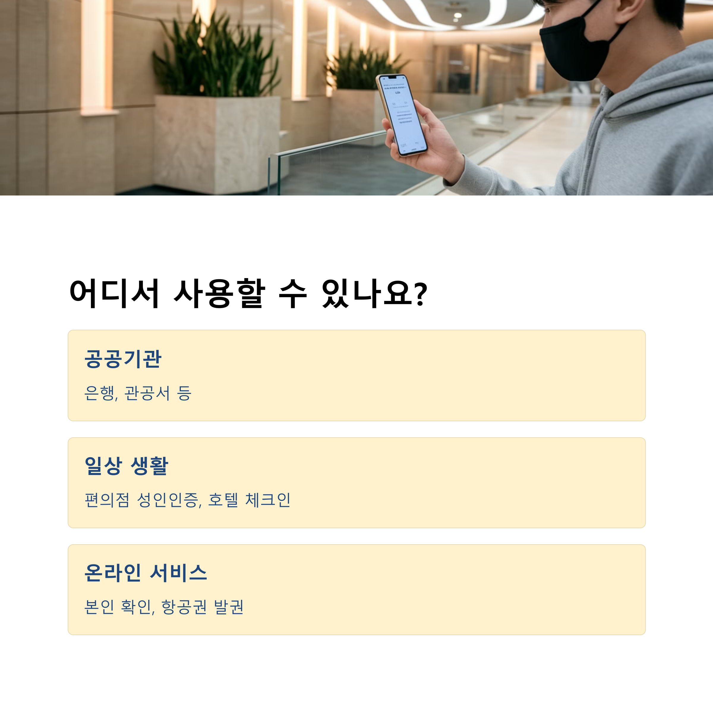 - 언제 어디서나 간편한 신원 확인관공서, 은행, 병원 등 다양한 기관에서 사용 가능