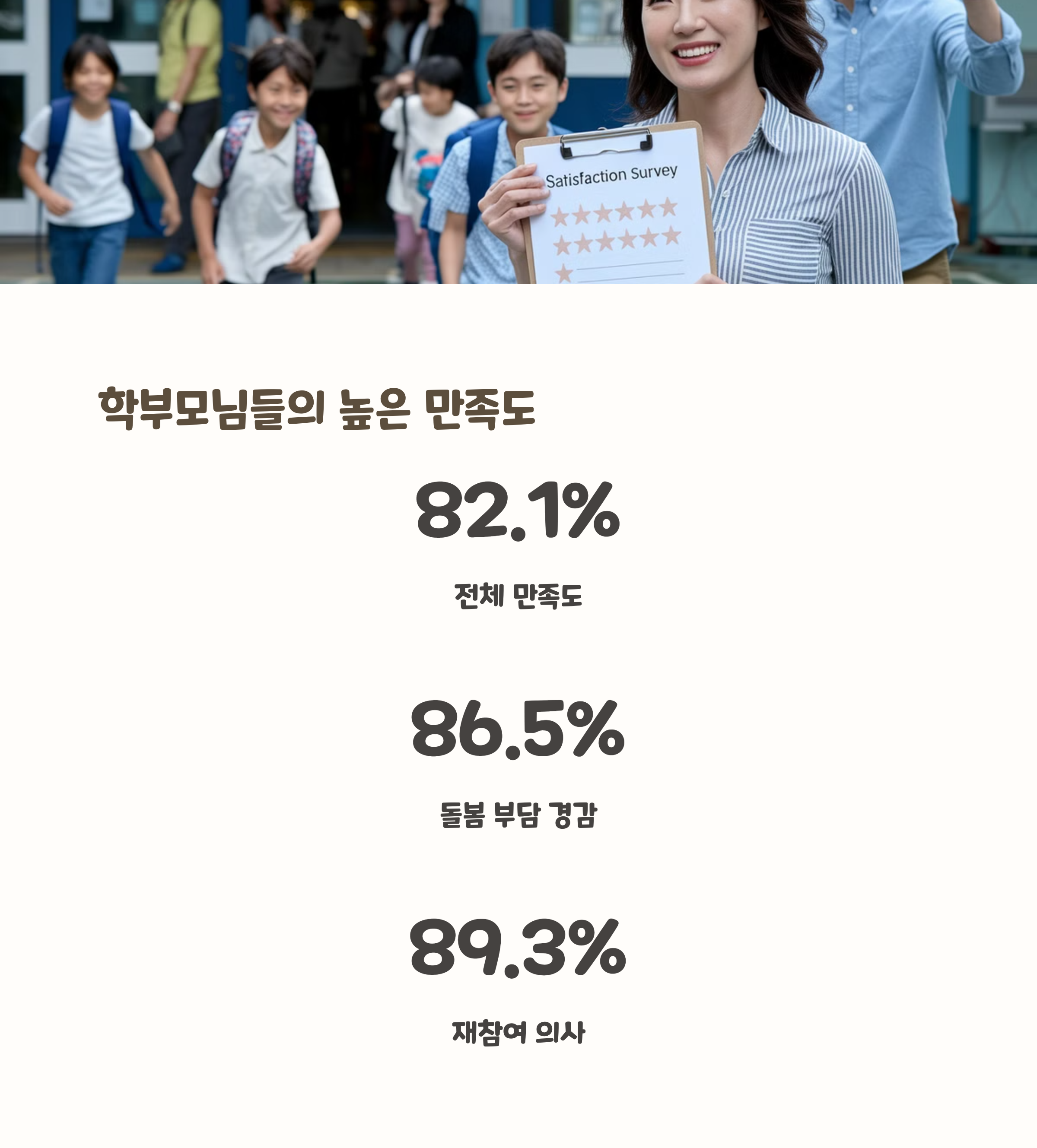 방과 후 학습 지원과 예체능 활동이 포함되면서, 사교육비 부담도 덜어줄 수 있습니다.