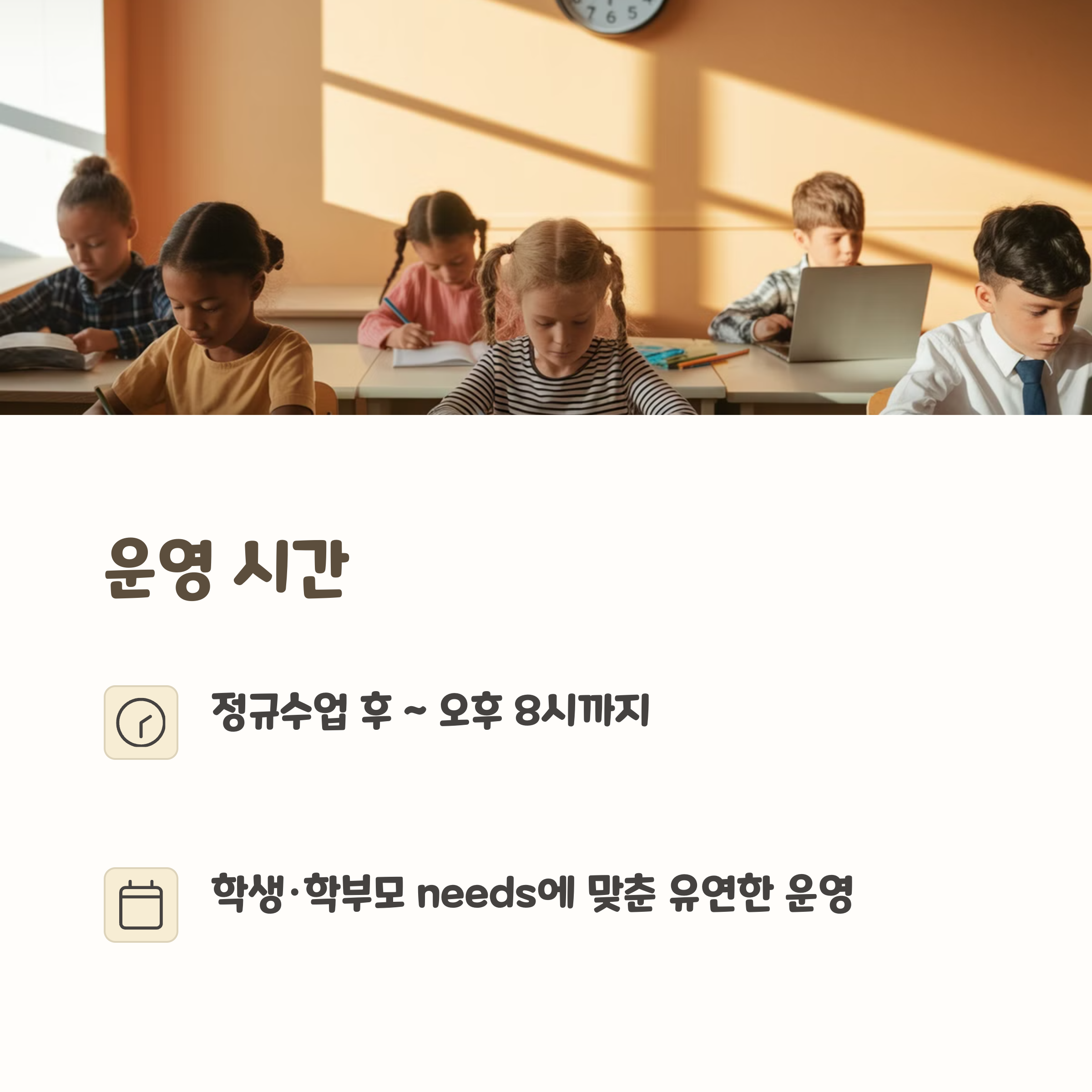 부모의 퇴근 시간까지 혼자 있거나 학원만 전전하는 것이 아니라, 학교에서 친구들과 함께 시간을 보내면서 심리적 안정감을 얻을 수 있습니다.