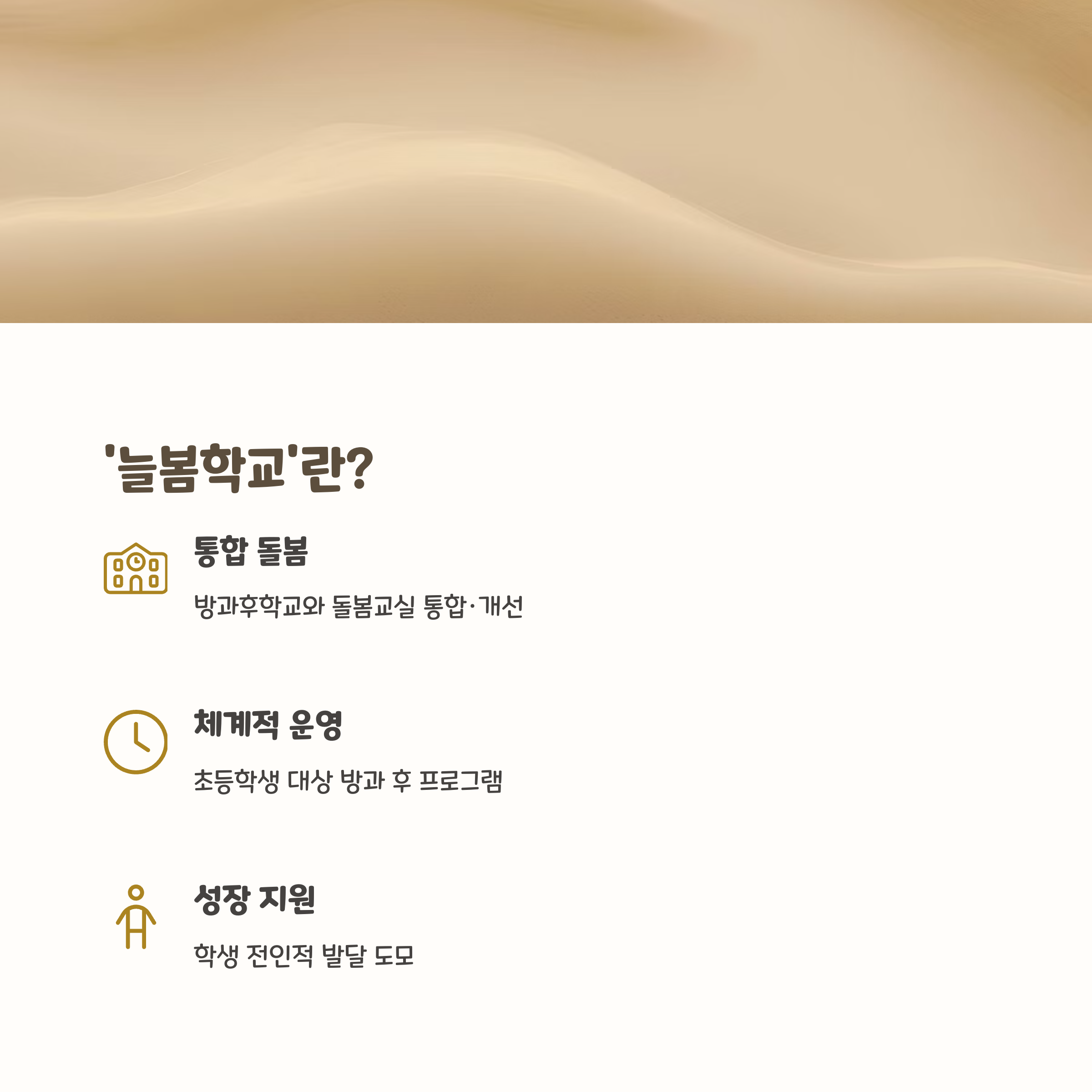 늘봄학교는 초등학생을 대상으로 정규 수업 이후에도 안전하게 돌봄과 학습을 제공하는 프로그램입니다.