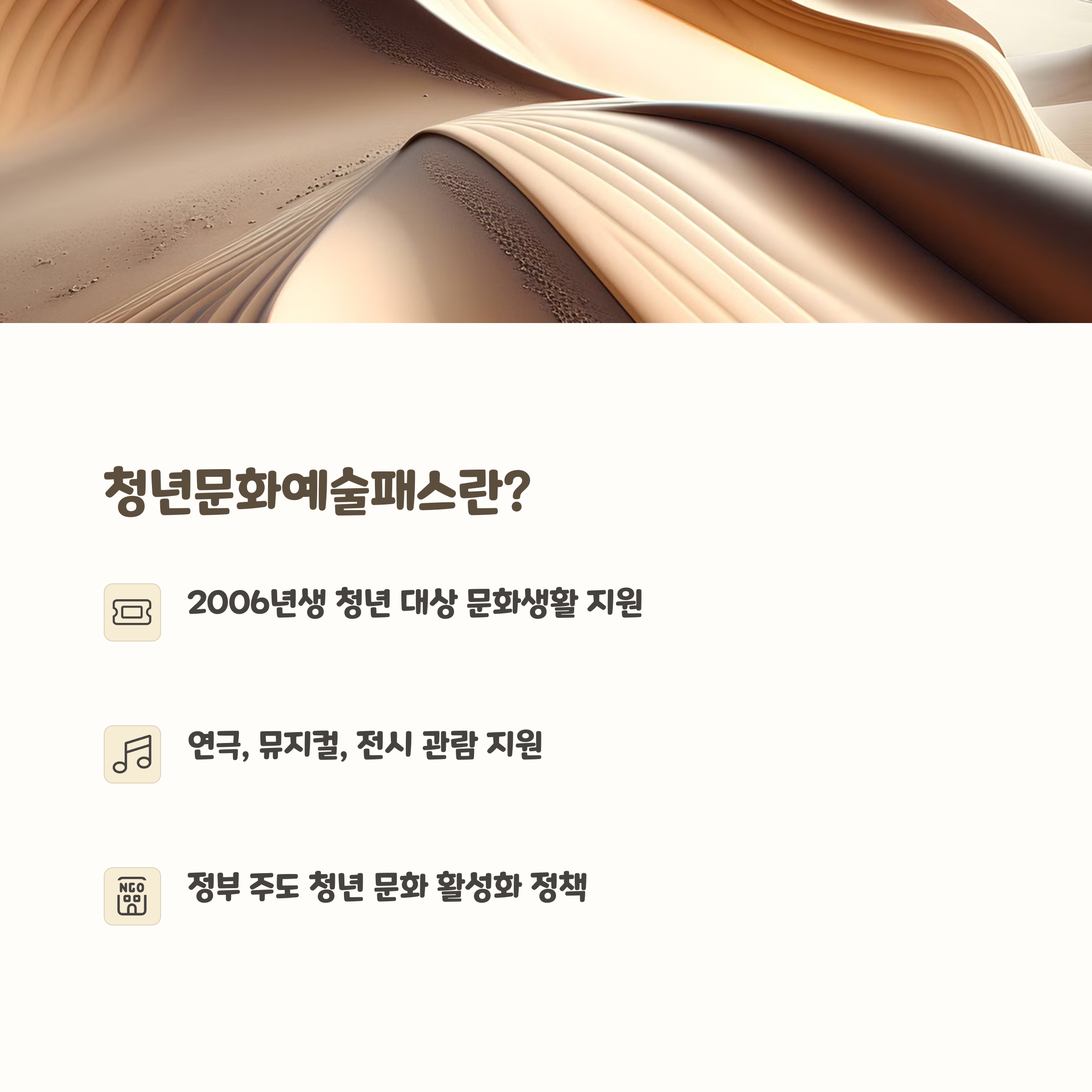 청년 문화예술패스는 문화생활을 즐기고 싶은 청년들에게 매우 유용한 지원책입니다. 공연, 전시, 영화 등 다양한 혜택을 받을 수 있으므로, 해당 연령대라면 놓치지 말고 신청하는 것이 좋습니다.