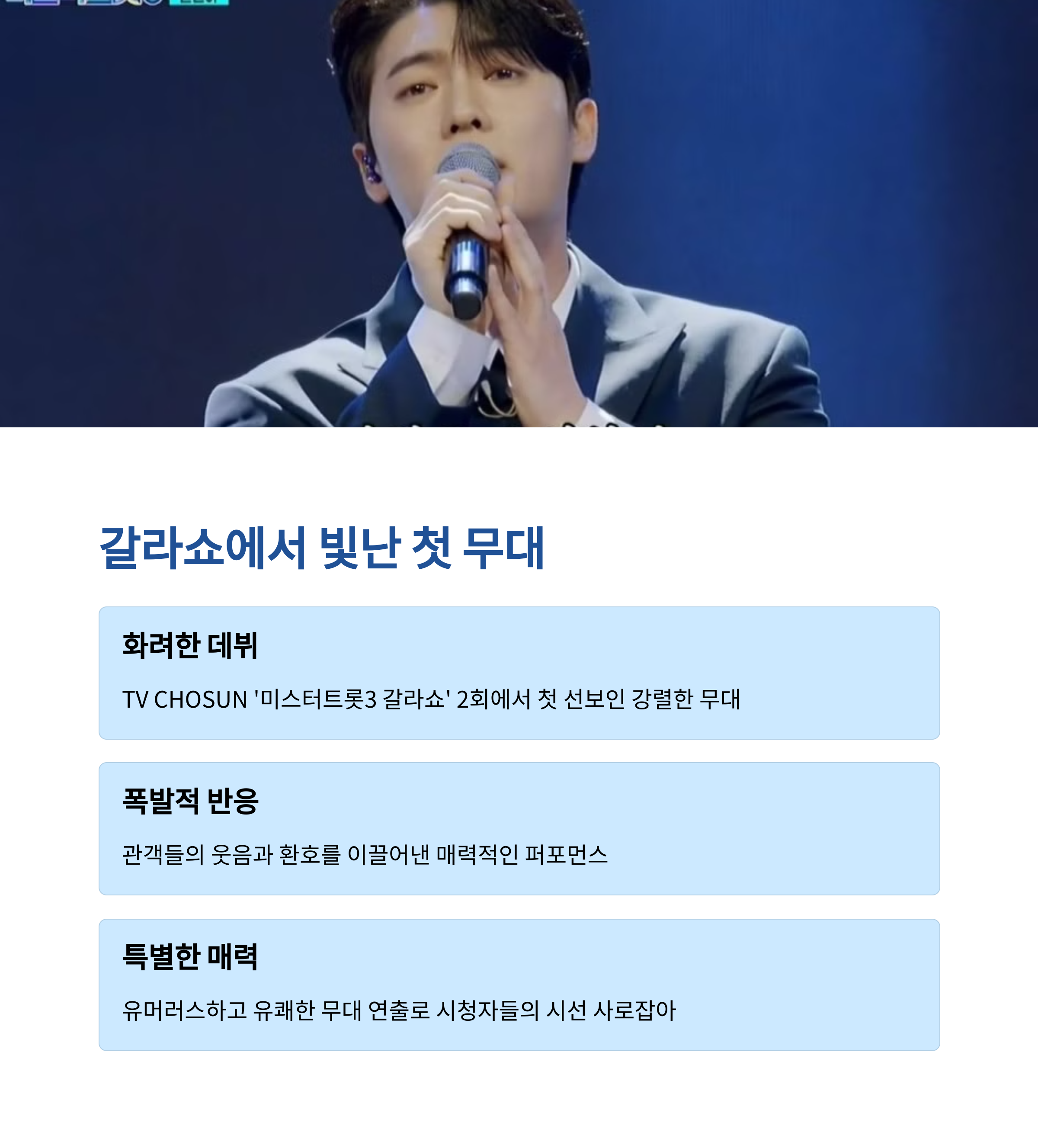 TV CHOSUN의 인기 프로그램 '미스터트롯3'가 화려한 피날레를 장식한 후, TOP7의 활약이 계속되고 있습니다. 2025년 3월 27일 목요일 밤 10시에 방영된 '미스터트롯3 갈라쇼' 2회에서는 기대하던 TOP7의