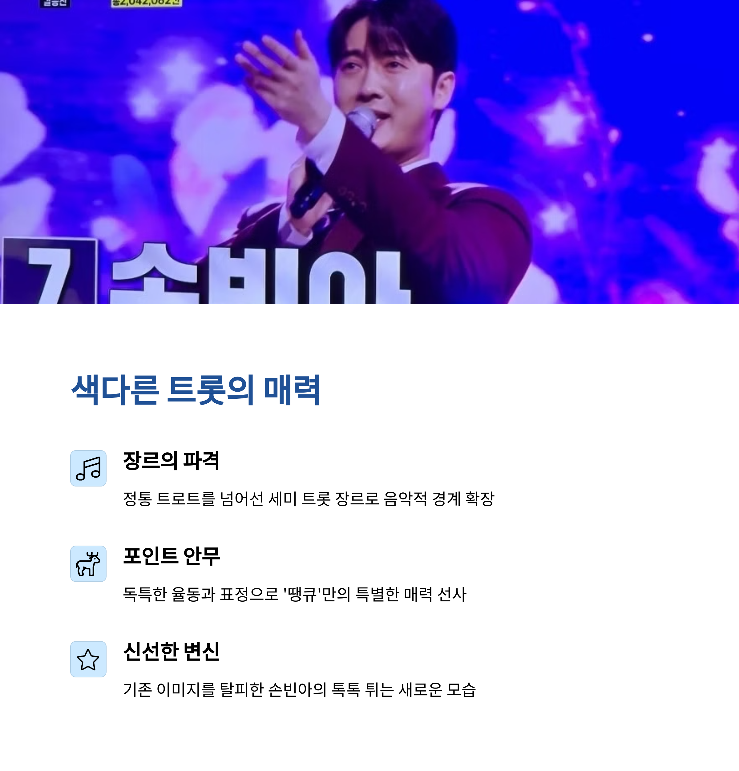 손빈아는 그동안 진중하고 단단한 트롯 창법으로 많은 사랑을 받아왔습니다. 하지만 이번 신곡 '땡큐'는 기존의 이미지에서 벗어나 좀 더 대중적이고 유쾌한 색깔을 담아낸 곡입니다. 무대에서 보여준 파격적인 의상과 포인트 안무, 그리고 눈에 띄는 표정 연기는 트로트의 경쾌함을 살리면서도 손빈아만의 개성을 더욱 확고히 했다는 평가를 받고 있습니다. '땡큐'라는 제목처럼 팬들과 대중에게 감사의 메시지를 담은 이 곡은 듣는 이로 하여금 밝은 에너지와 긍정적인 기운을 전달합니다.