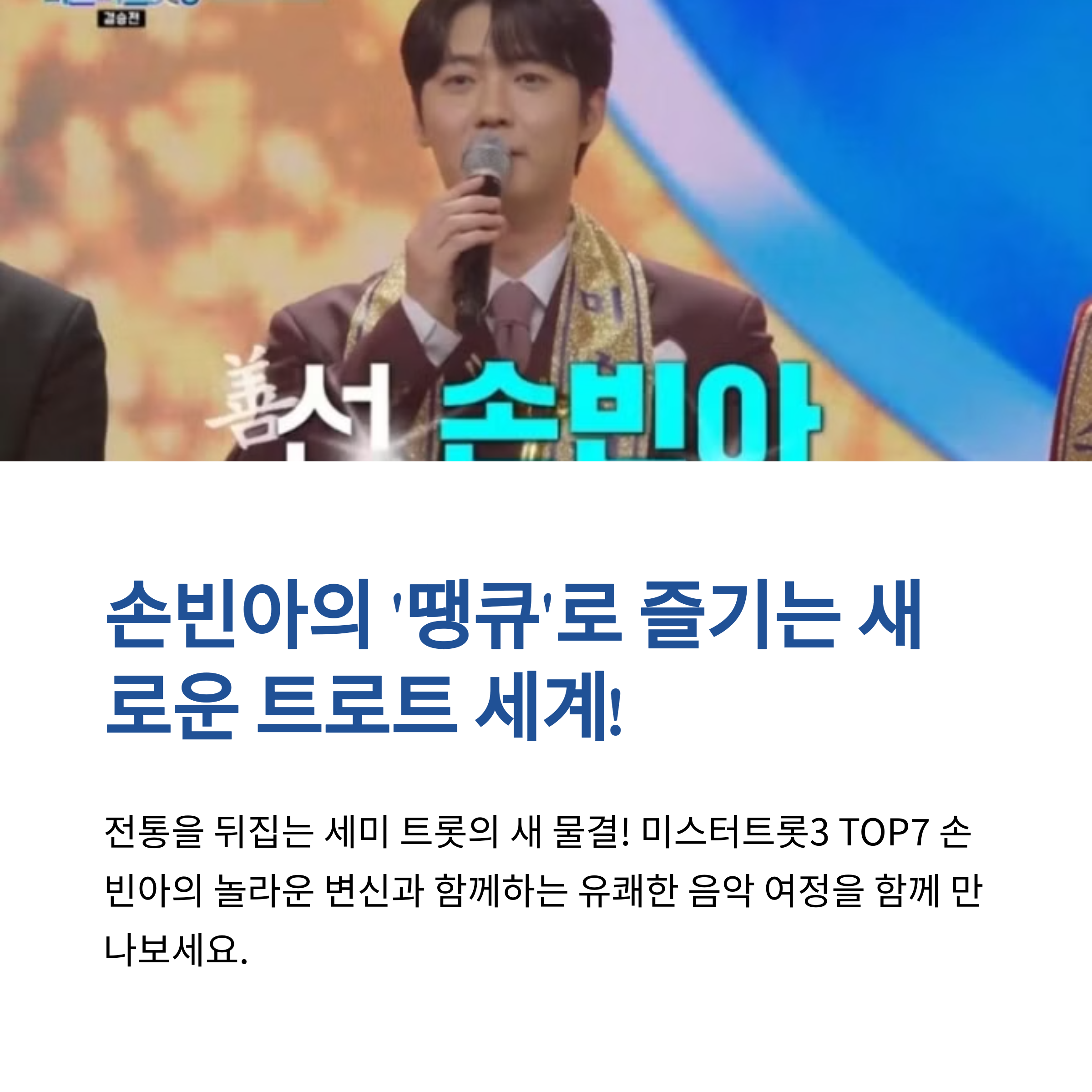 트로트 팬들의 기대를 한 몸에 받고 있는 손빈아가 드디어 신곡 ‘땡큐’를 공개했습니다. TV CHOSUN ‘미스터트롯3 갈라쇼’ 2회에서 처음 선보인 이 무대는 기존의 이미지와는 다른 새로운 매력을 보여주며 많은 이들의 관심을 모았습니다. 특히 이번 곡에서는 정통 트로트에서 살짝 벗어나 유머러스하고 유쾌한 세미 트롯 장르로 변신해 손빈아만의 톡톡 튀는 매력을 한껏 뽐냈습니다. 포인트 안무와 함께한 무대는 관객들에게 즐거운 웃음을 전하며 큰 호응을 얻었습니다. 더불어 이 곡은 3월 28일 발매된 ‘미스터트롯3’ TOP7 미니앨범에도 수록되어 음원사이트를 통해 공식 발매되었습니다. 손빈아의 다채로운 음악적 스펙트럼과 앞으로의 활약이 기대되는 가운데, 트로트 팬들에게 이번 곡은 놓칠 수 없는 즐거움이 될 것입니다.