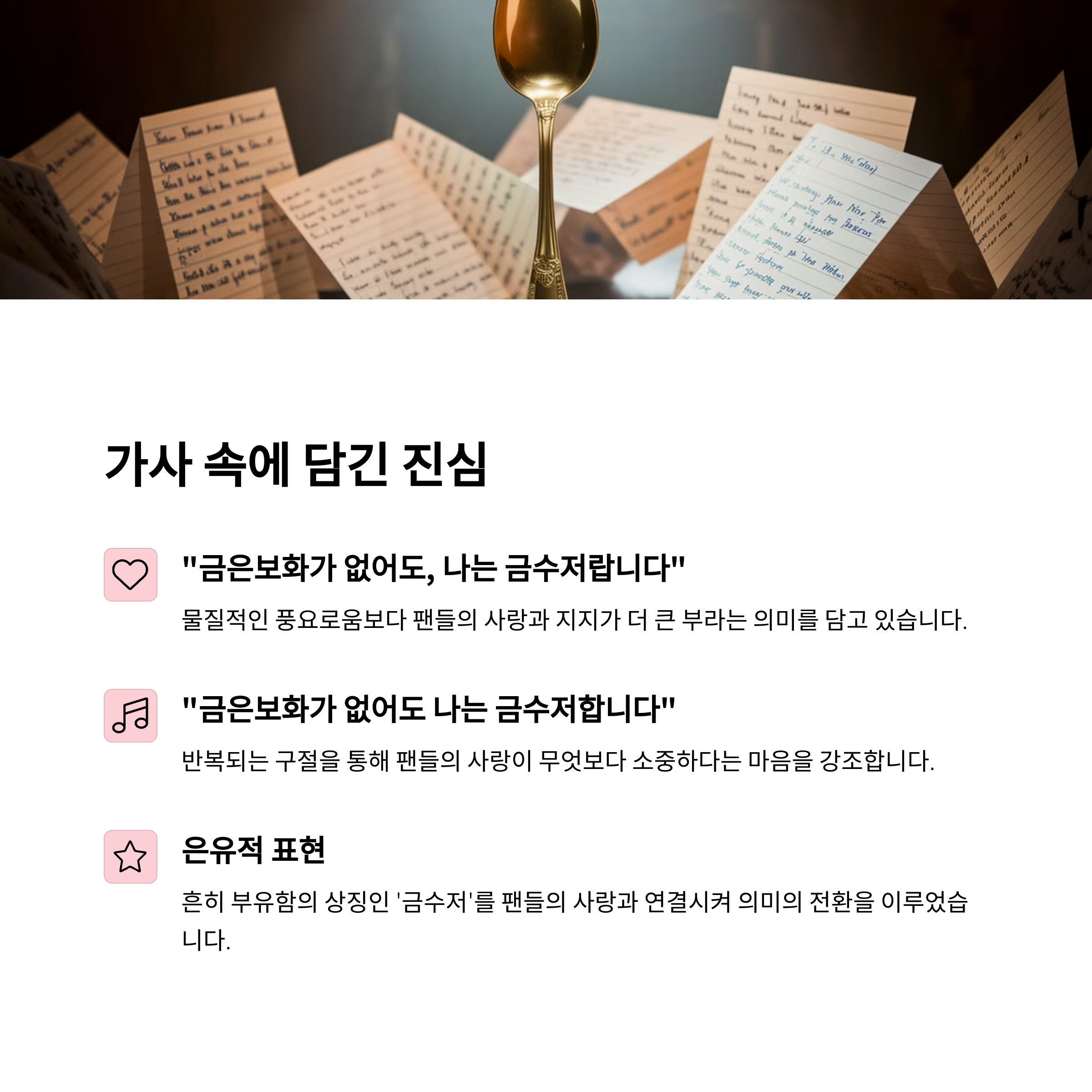 이번 곡의 핵심은 물질적인 금수저가 아니라, 관계에서 비롯된 금수저라는 철학입니다. 사랑하는 사람들과의 인연, 팬들과의 소통, 그 속에서 얻는 감정적 부유함이야말로 진짜 금수저 아닐까요? '그대가 나의 금수저'라는 마지막 구절은 그러한 감정을 완벽히 압축해 전달하며, 듣는 이에게도 깊은 여운을 남깁니다.