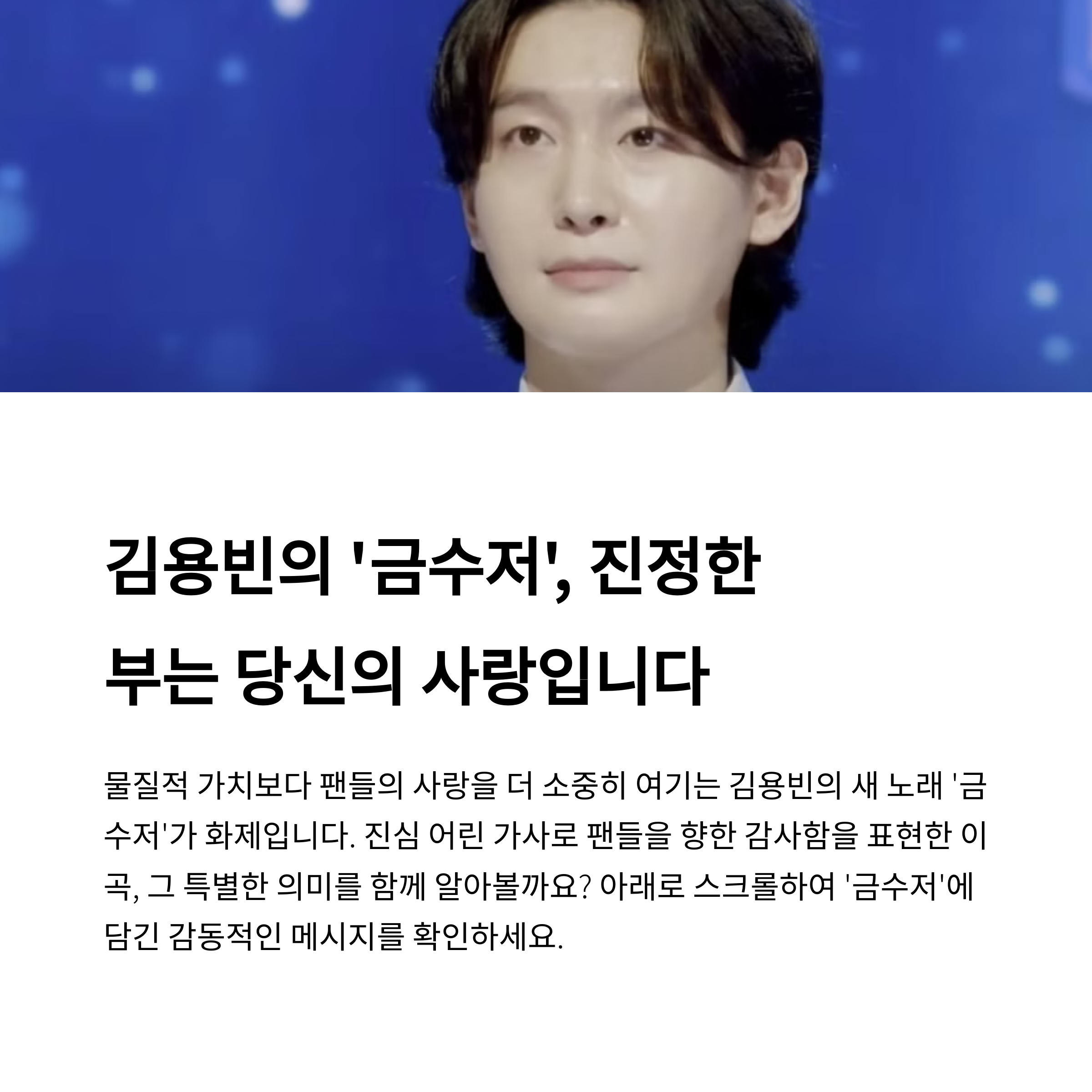 금수저 물고 태어난 사나이? 대중의 마음을 적신 그 목소리최근 발표된 김용빈의 신곡 ‘금수저’는 단순한 트로트 이상의 감동을 전달하며 대중들의 귀를 사로잡고 있습니다. 부드러운 음색과