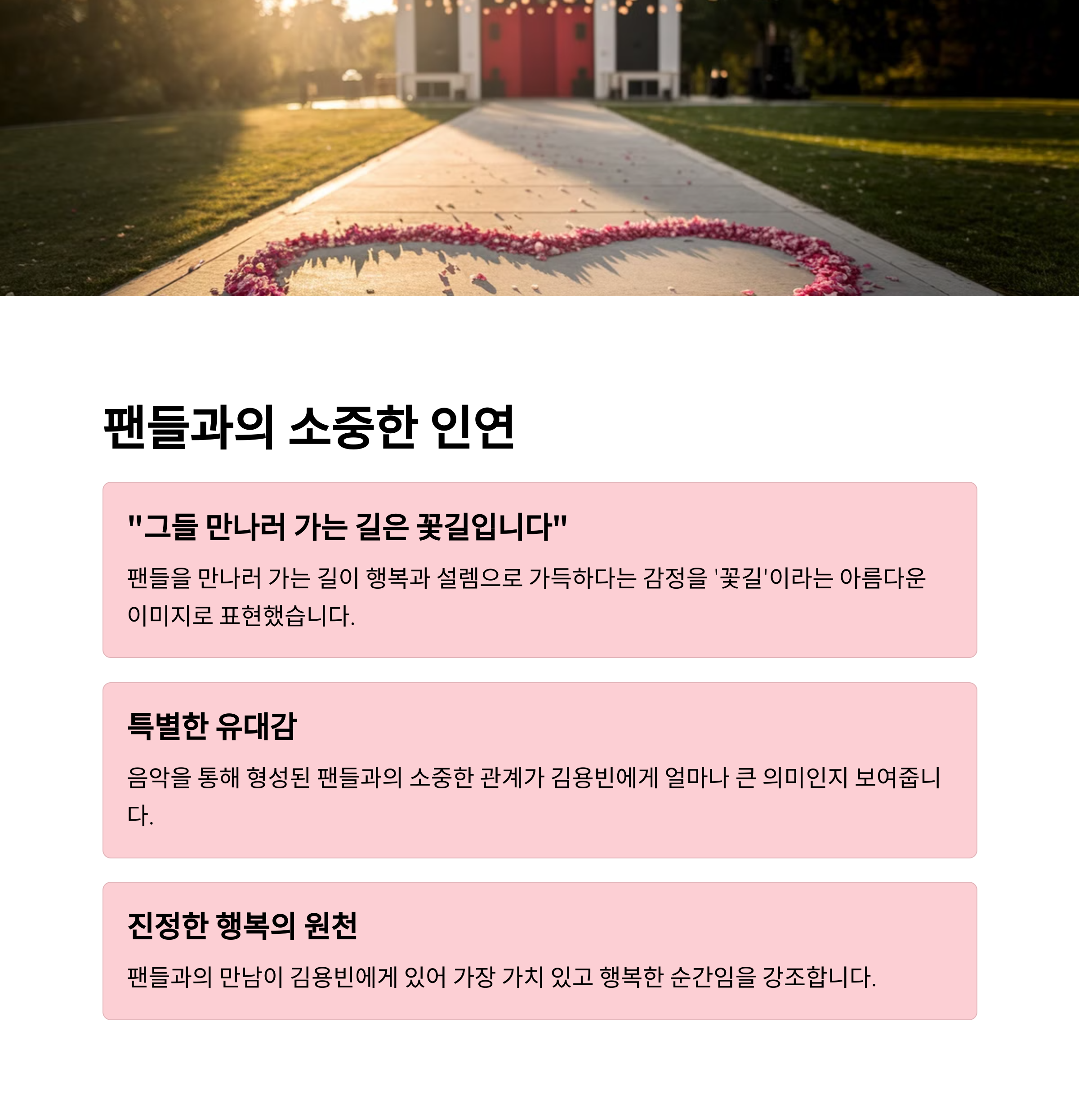 '그들 만나러 가는 길은 꽃길입니다'라는 표현은 단순한 팬 서비스를 넘어서, 팬들을 향한 감사의 여정이 얼마나 소중한지 보여줍니다. 팬들과의 만남을 꽃길이라 표현한 김용빈의 감성은 단순한 가사의 역할을 넘어, 팬들에게 진심 어린 위로와 감동을 전달하는 매개체가 됩니다. 그의 진심은 음악을 통해 고스란히 전달되며, 많은 팬들의 공감을 얻고 있습니다.