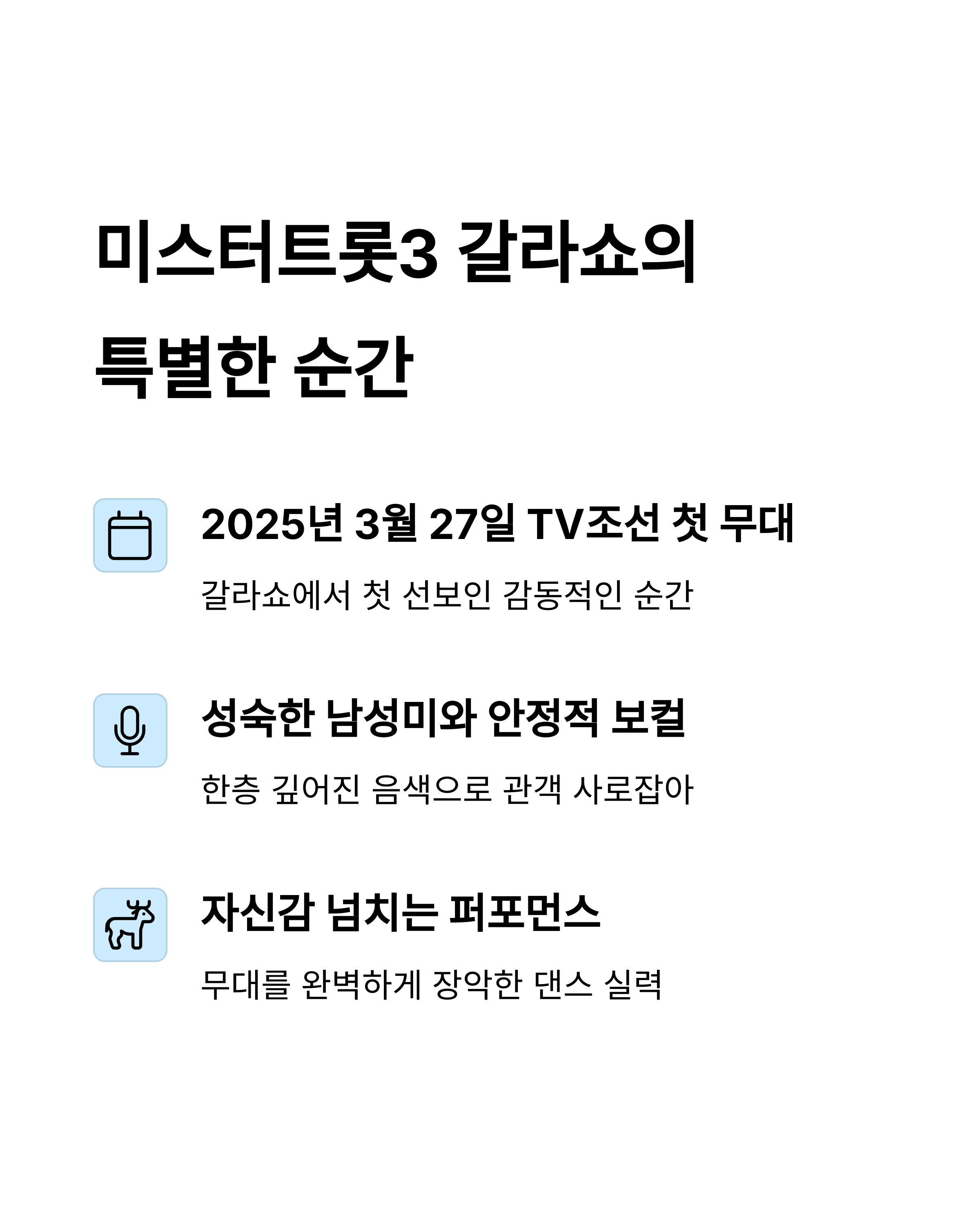 | 성장한 남성 이미지와 새로운 음악 세계 | 감성 트롯과 댄스 퍼포먼스의 조화 | 갈라쇼에서 공개된 폭발적 무대 |