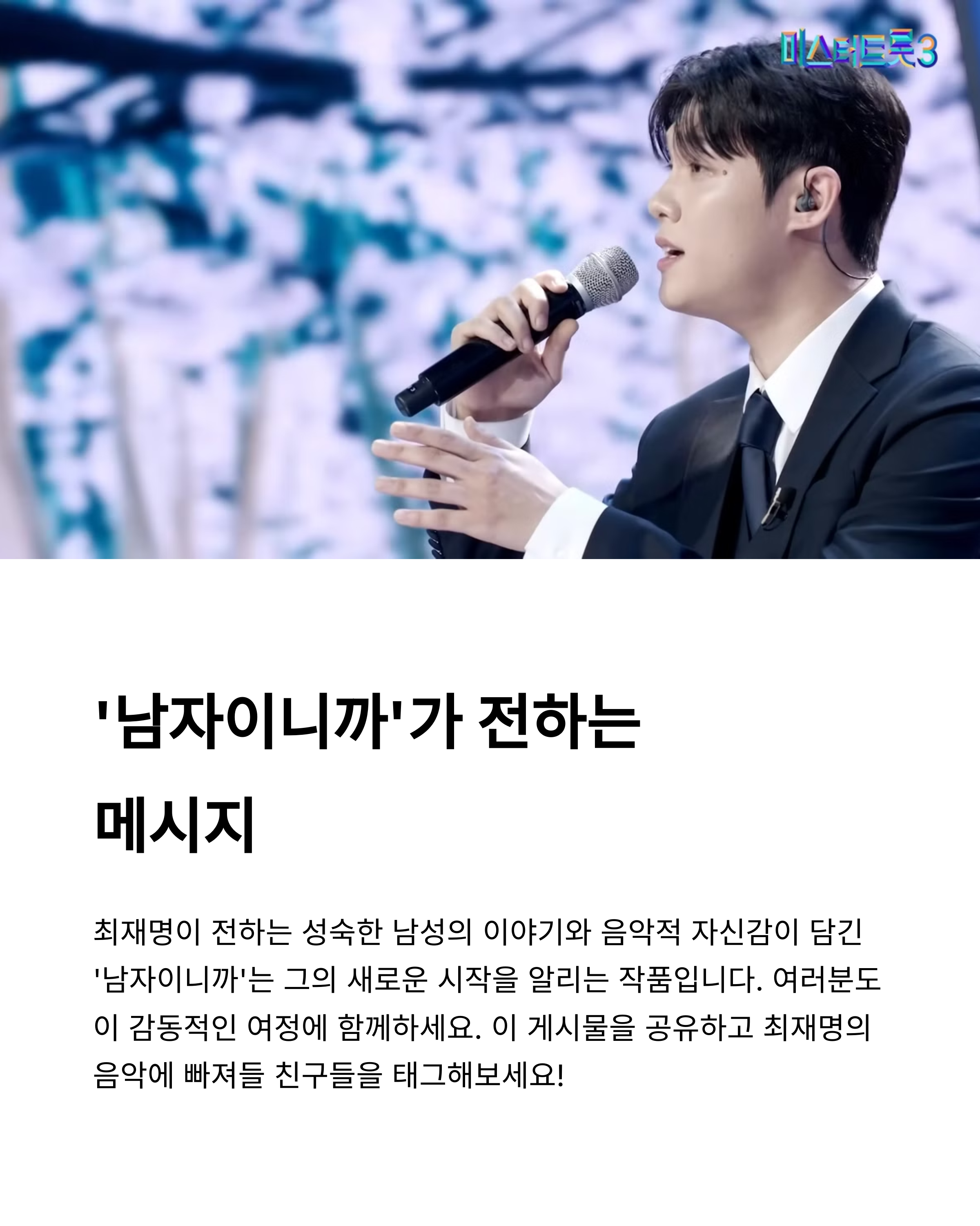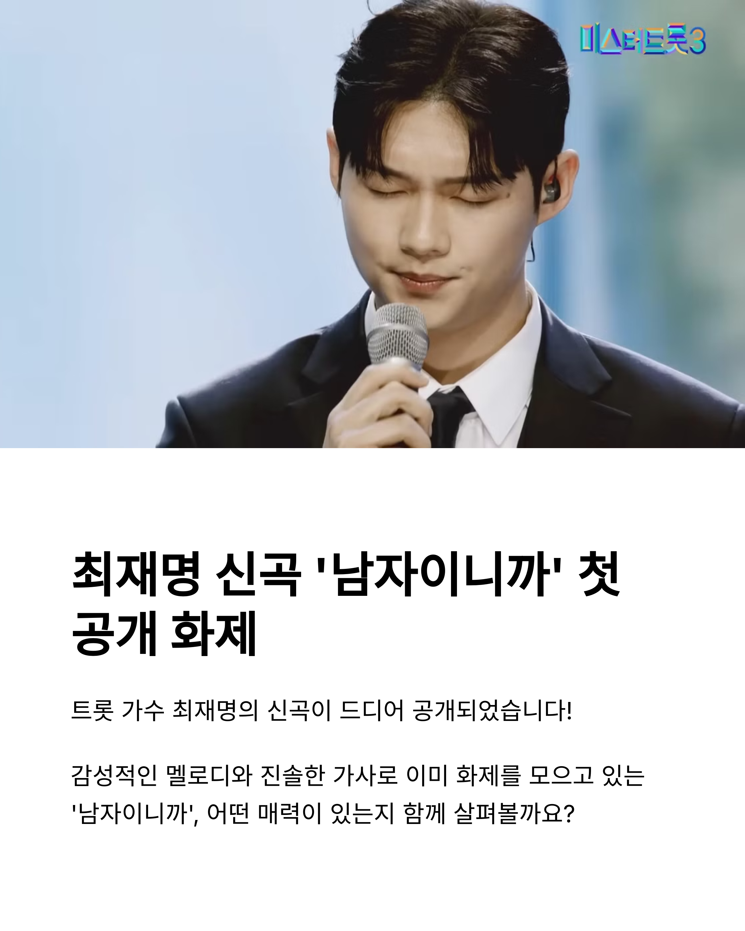 2025년 3월 27일, TV조선의 '미스터트롯3 갈라쇼'를 통해 최재명이 선보인 신곡 '남자이니까'가 뜨거운 화제를 모으고 있습니다. 해당 곡은 방송 직후 다양한 온라인 커뮤니티와 SNS 상에서 빠르게 확산되며 수많은 팬들의 관심을 받고 있는데요.