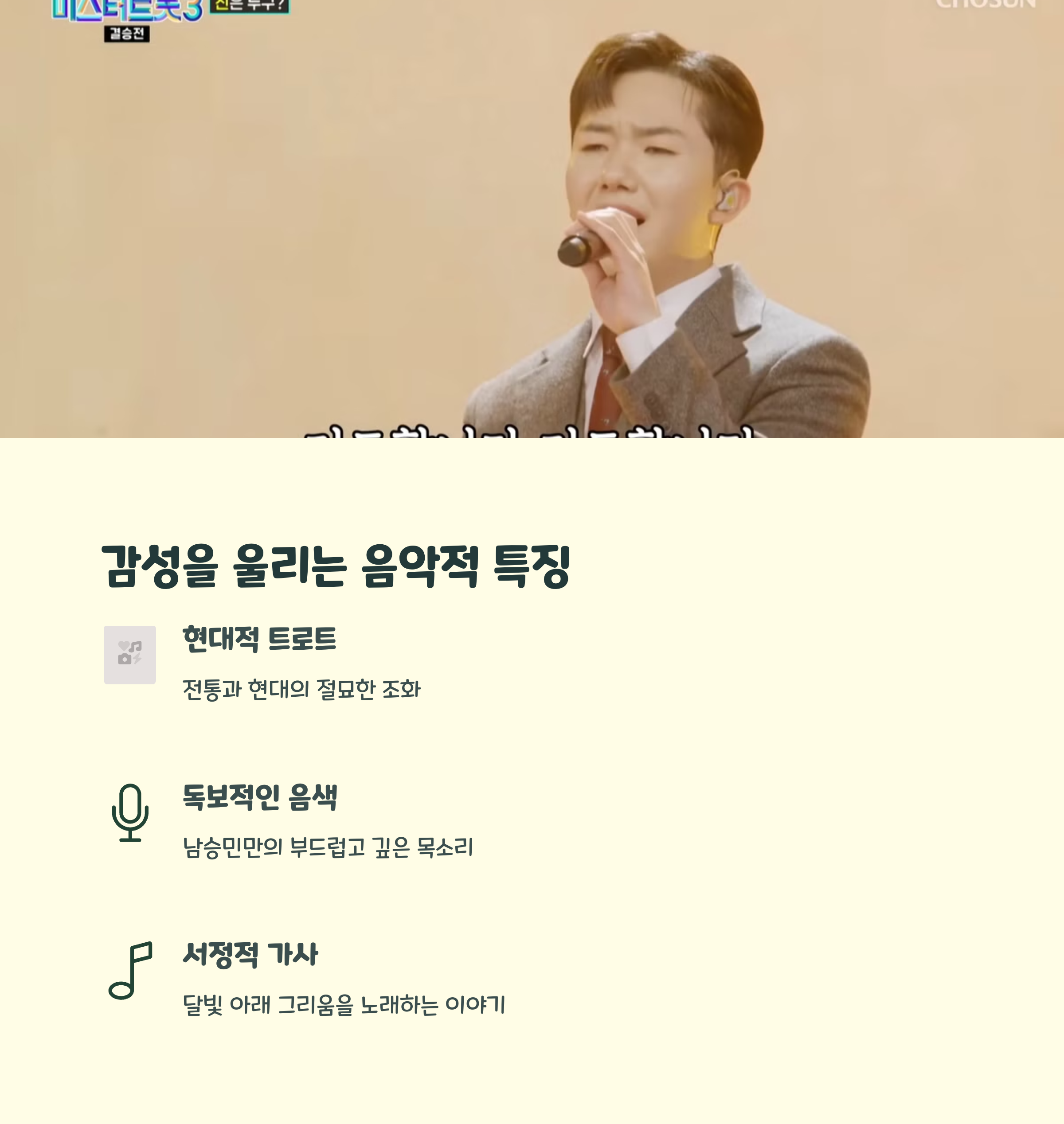 | 남승민 음악 스타일 | 정통성과 현대적 감성을 아우르는 트로트 |