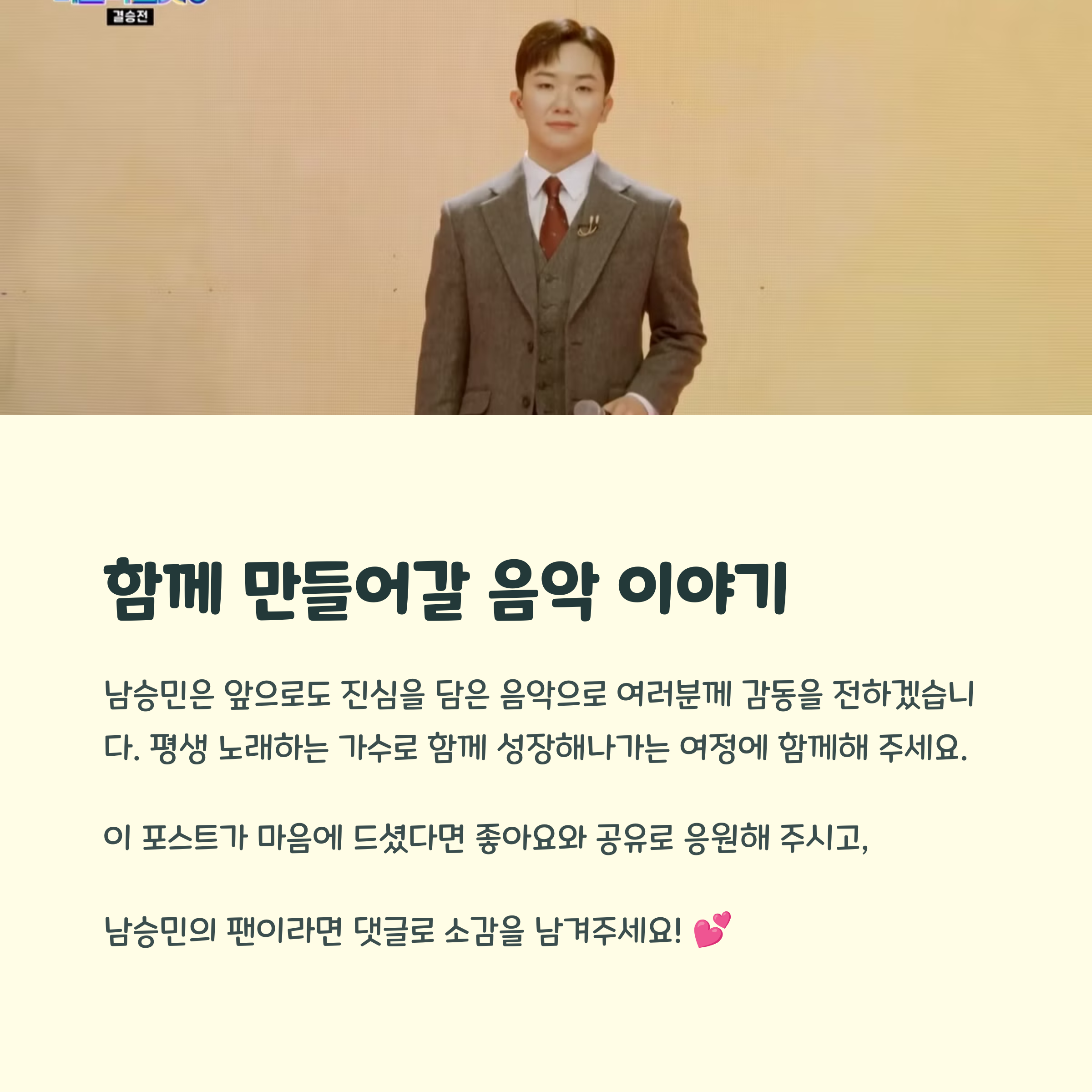 3월 27일 방송된 '미스터트롯3 갈라쇼'에서 첫 공개된 이 곡은, 관객들의 뜨거운 환호 속에서 성공적인 데뷔 무대를 선보였습니다. 더욱이 유명 작곡가 창민(2AM)의 참여는 곡의 완성도를 높였으며, 남승민은 무대 위에서의 안정감 있는 표현력과 성숙해진 무대 매너로 본인의 음악적 깊이를 뚜렷이 드러냈습니다. 그의 무대는 단순한 노래 이상의 감동을 안겨주며 관객과 진심으로 소통하는 가수로 거듭나고 있습니다.