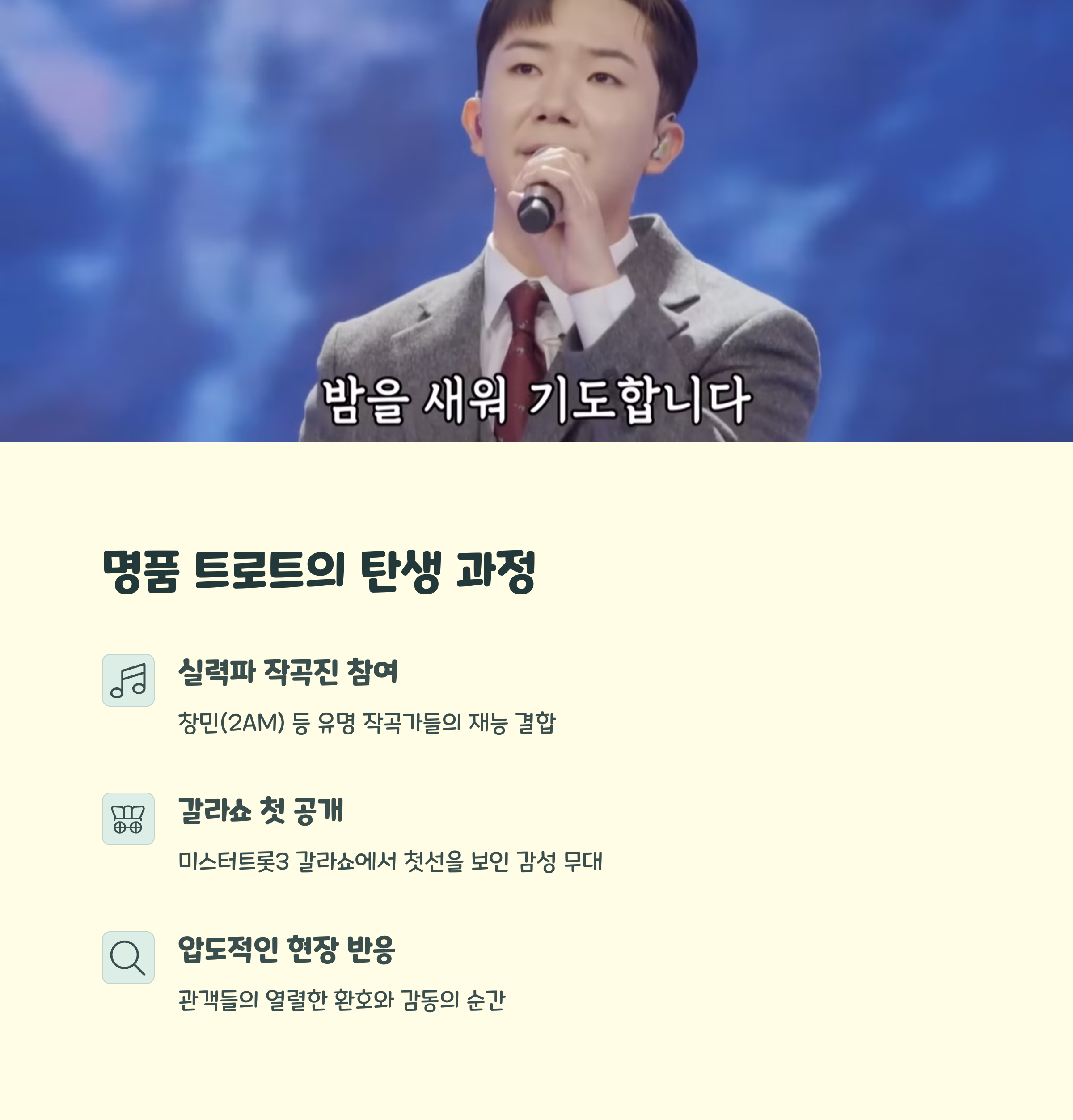 | 달빛 아래 그리움을 담은 트로트 감성 | 갈라쇼에서 선보인 감동의 첫 무대 | 전통과 현대를 아우른 새로운 시도 |