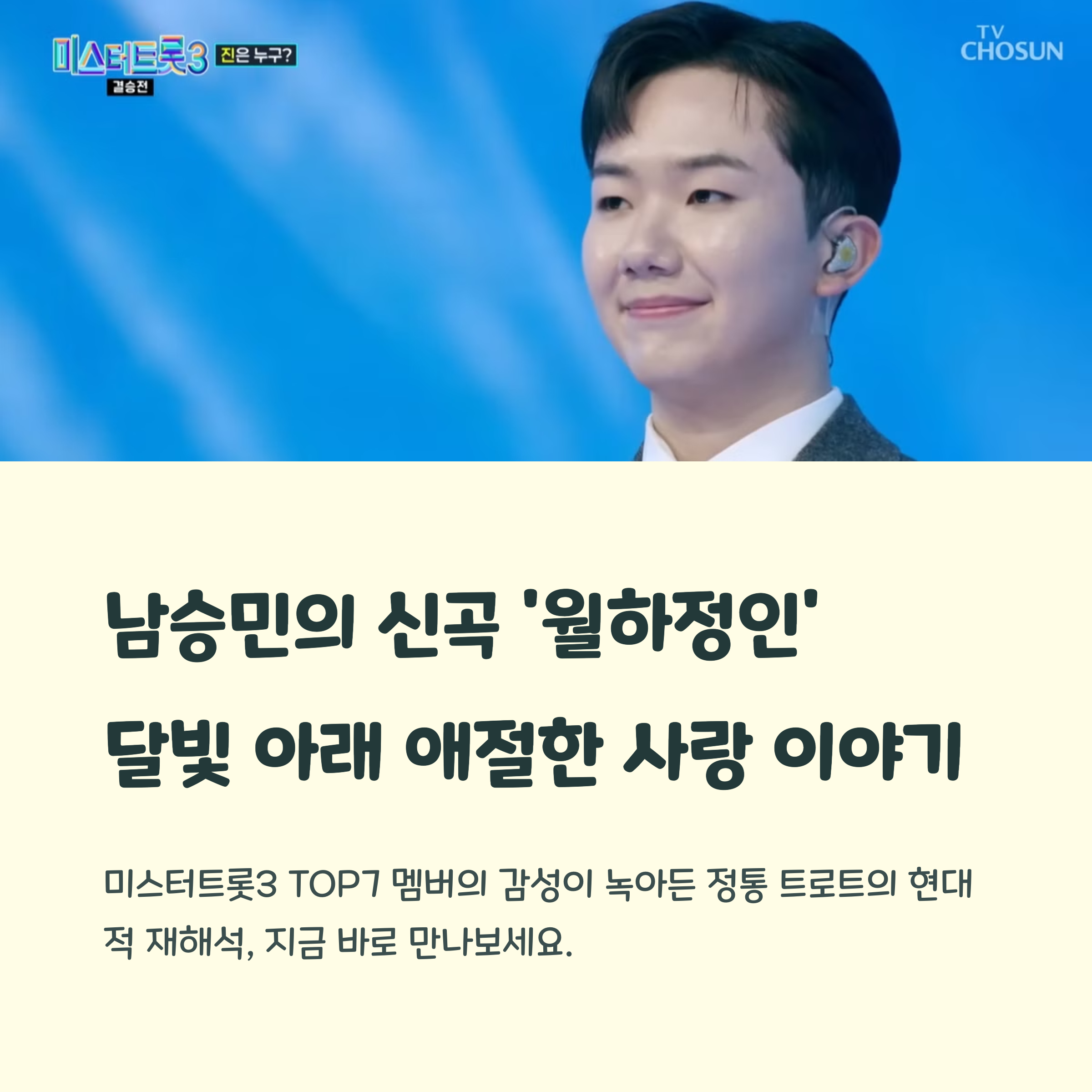 트로트 팬들에게 진한 감동과 울림을 선사한 '미스터트롯3'의 TOP7 멤버, 남승민의 새로운 행보가 주목받고 있습니다. 최근 발표된 신곡 '월하정인'은 정통 트로트의 매력을 유지하면서도 젊은 감성을 입힌 곡으로 큰 사랑을 받고 있는데요. 특히 3월 27일 방송된 갈라쇼 무대를 통해 처음으로 선보인 이번 곡은 그의 성장한 음악 세계와 깊어진 감성을 잘 보여줍니다. 무대 위에서의 카리스마와 무대 밖에서의 겸손한 태도까지, 다양한 매력으로 무장한 남승민. 그의 음악은 세대를 초월한 공감을 이끌어내며, 새로운 트로트의 방향을 제시하고 있습니다. 오늘은 그가 전하는 '월하정인'이라는 곡에 담긴 이야기를 중심으로, 트로트가 지닌 감성과 현재의 변화를 함께 들여다보려 합니다.