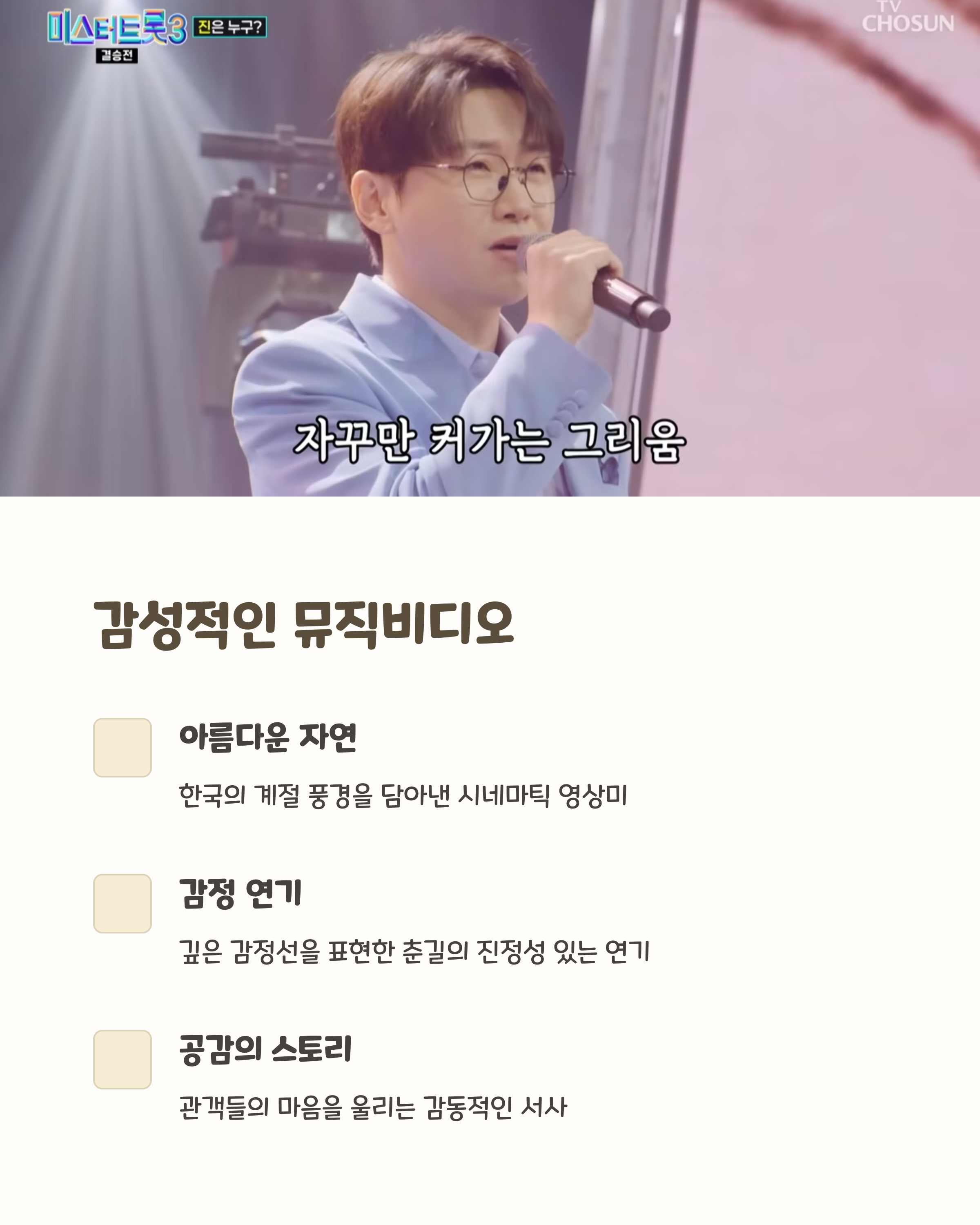 | 전통과 현대의 감성을 모두 담은 세련된 트로트 | 자연 풍경과 감성 연기로 이목 집중 | 세대를 아우르는 인기와 호응 확보 |