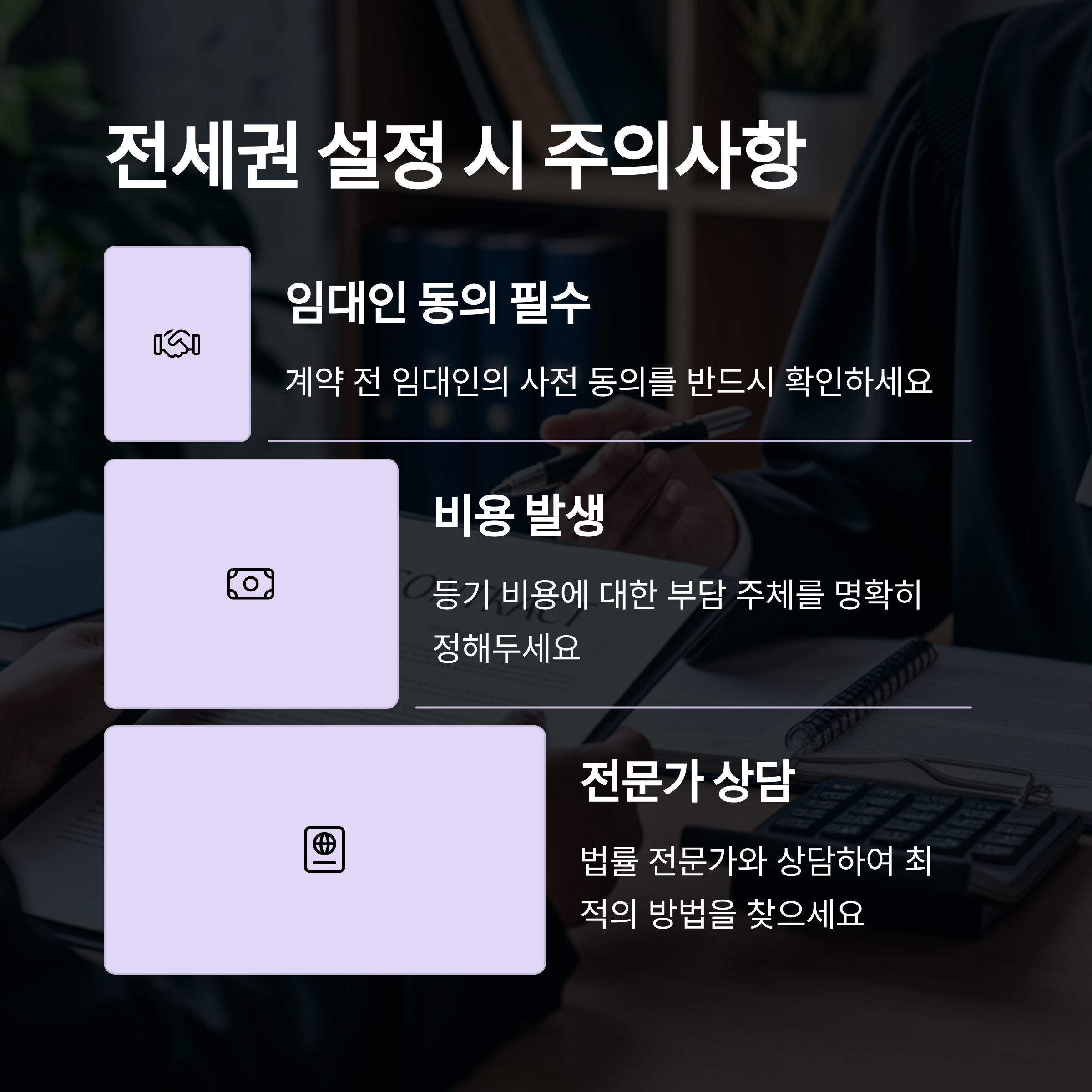 | 물권으로서 소유자 변경에도 권리 유지 | 소송 없이도 경매 신청 가능 | 계약 전 반드시 협의 필요 |