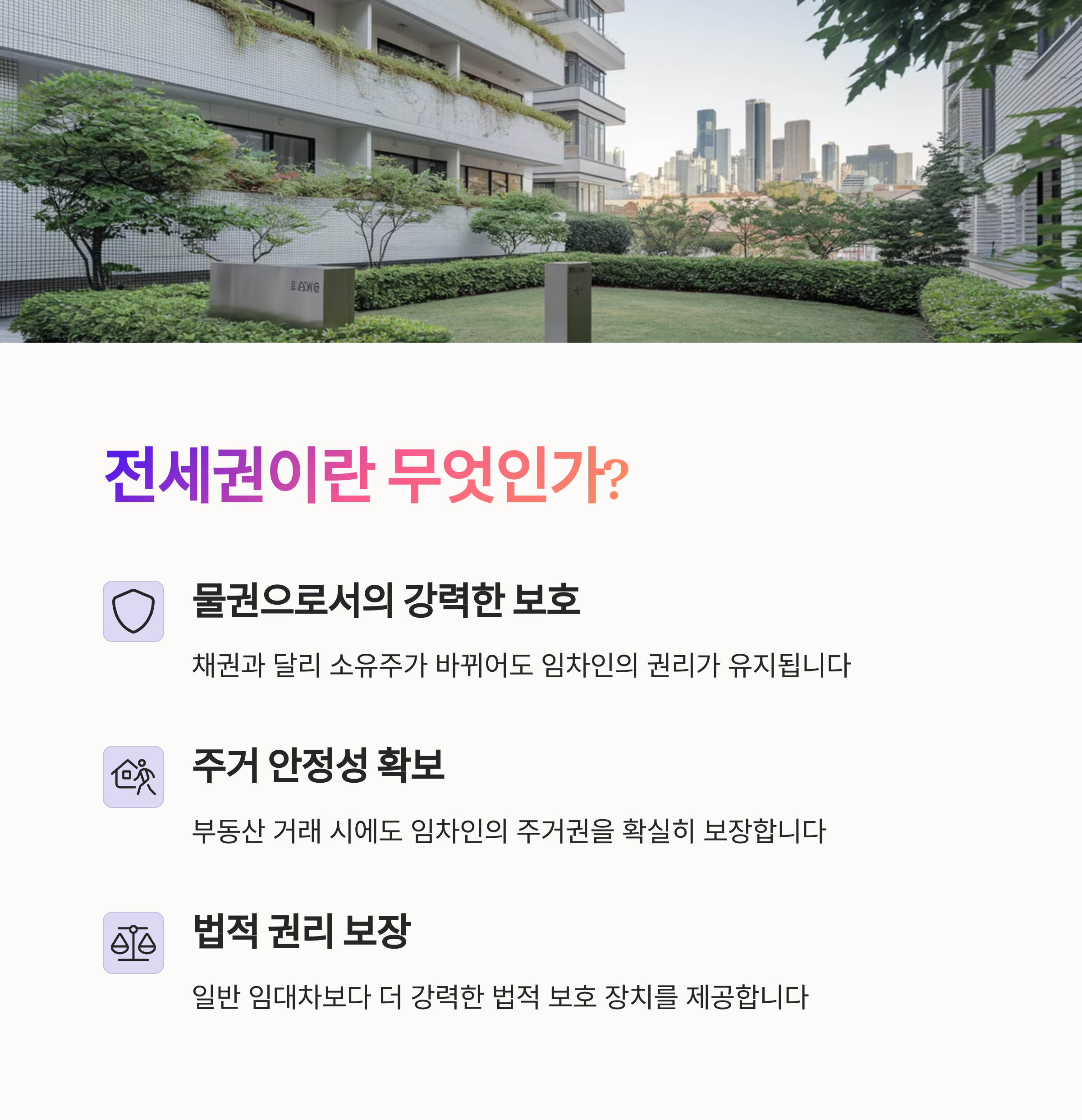 | 전세권 등기란? | 임차인의 권리를 법적으로 보장하는 등기 절차입니다. |