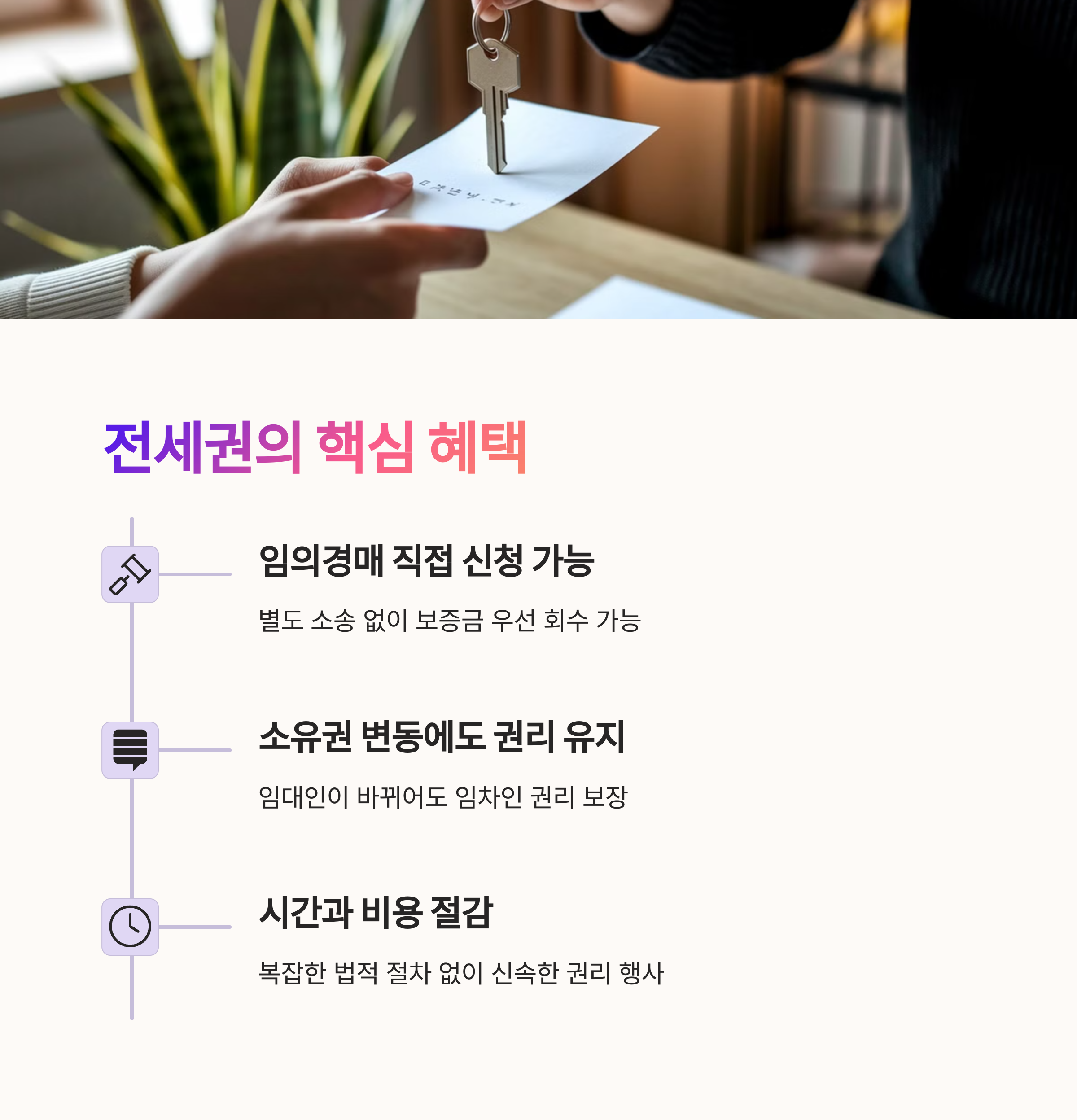 전세권 설정을 통해 임차인은 소유자 변경, 부동산 경매, 강제집행 등 예기치 못한 상황 속에서도 확실한 우선순위를 가지게 됩니다. 이는 단순히 집에 거주할 수 있는 권리를 넘어서, 보증금 회수에 대한 강력한 법적 안전장치가 됩니다. 특히 임차인에게는 시간과 비용을 절약할 수 있는 실질적인 효과도 있습니다. 전세 계약 당시 임대인과의 합의를 통해 설정등기를 진행하면, 나중에 분쟁이 발생했을 때 보다 강력한 협상력을 가지게 됩니다.
