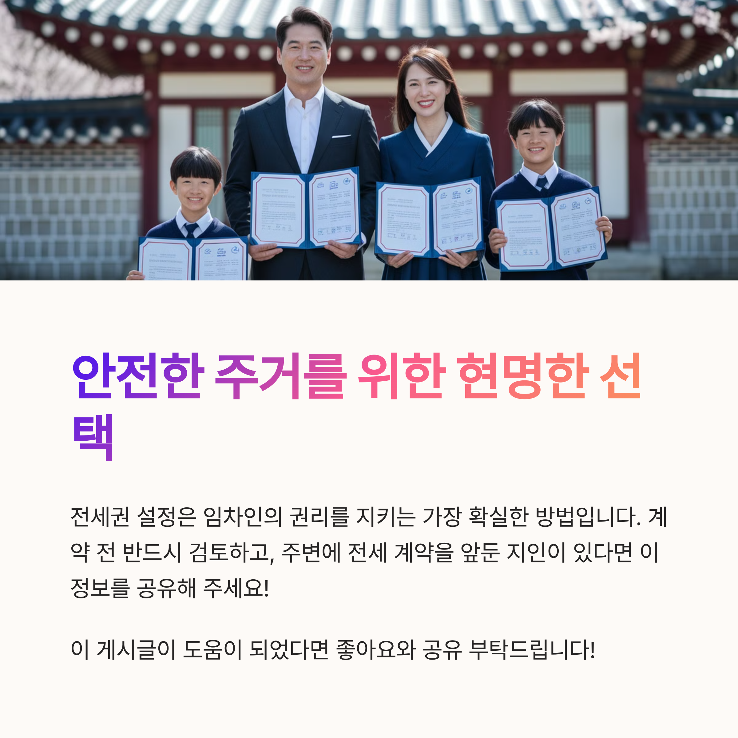 전세권 설정등기는 단순한 선택이 아니라, 내 자산을 지키기 위한 필수적 전략입니다. 특히 고액의 전세 보증금을 맡기는 입장이라면, 법적인 안전망을 확실히 확보해야 합니다. 전세권 설정은 처음에는 번거롭고 비용이 들 수 있지만, 나중에 발생할 수 있는 분쟁이나 손해에 비하면 훨씬 작은 투자입니다. 오늘 글을 통해 전세권 설정의 중요성과 효력에 대해 깊이 있게 이해하셨길 바랍니다.