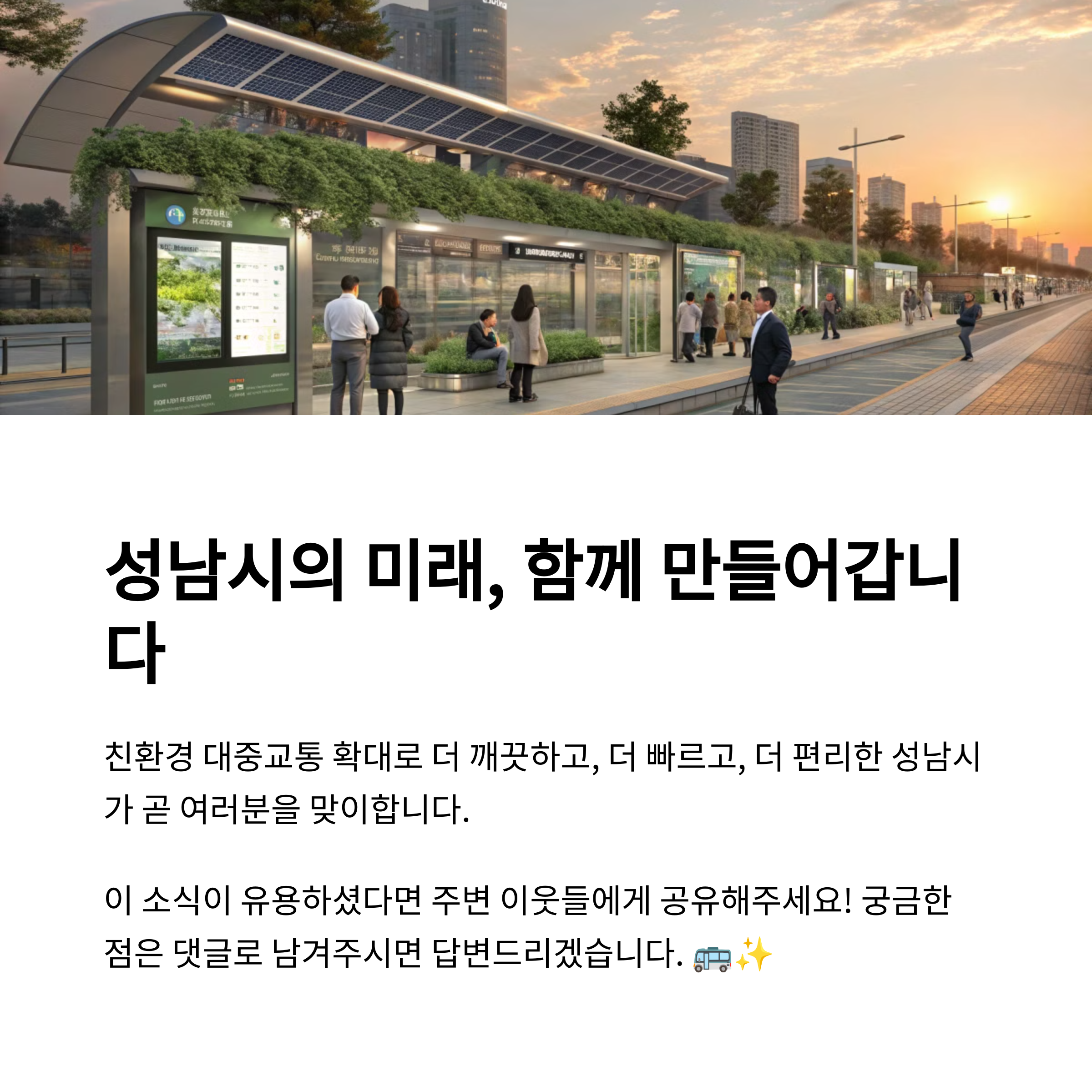 성남~복정 BRT 노선은 단순한 교통 인프라 확장을 넘어, 도시의 패러다임 전환을 상징합니다. 효율적인 통근 환경, 혼잡 완화, 도시재생 효과까지 더해져 성남 시민들의 삶의 질을 높이는 데 큰 역할을 할 것입니다. 특히 구도심 중심의 정비와 연계된 계획은 기존 지역 주민들에게도 긍정적인 변화를 체감할 수 있는 기회를 제공하며, 성남이라는 도시의 브랜드 가치 또한 크게 향상될 것으로 보입니다. 이제는 교통이 단순한 이동 수단을 넘어서, 도시의 가치를 높이는 핵심 자산으로 작용하는 시대입니다. 이번 BRT 구축이 그 대표적인 사례가 되기를 기대합니다.