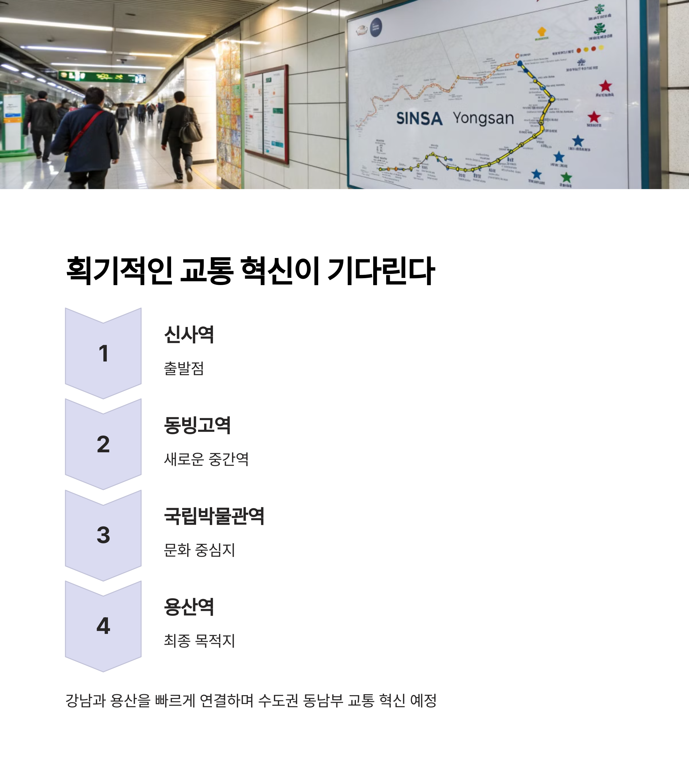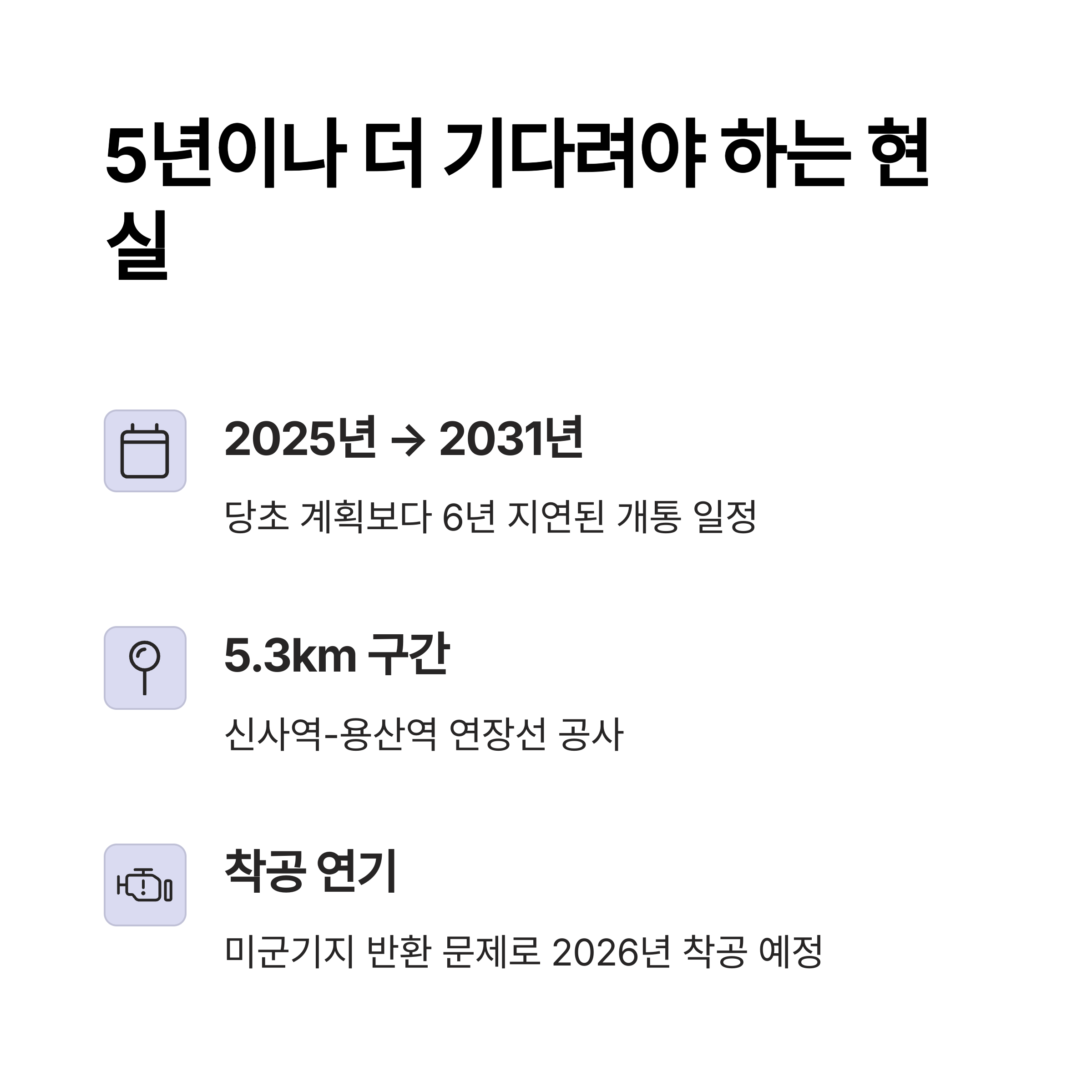 | 원래 2025년이던 착공이 2026년으로 연기 | 동빙고역, 국립박물관역 추가 검토 중 | 용산기지 반환 일정과 직결 |