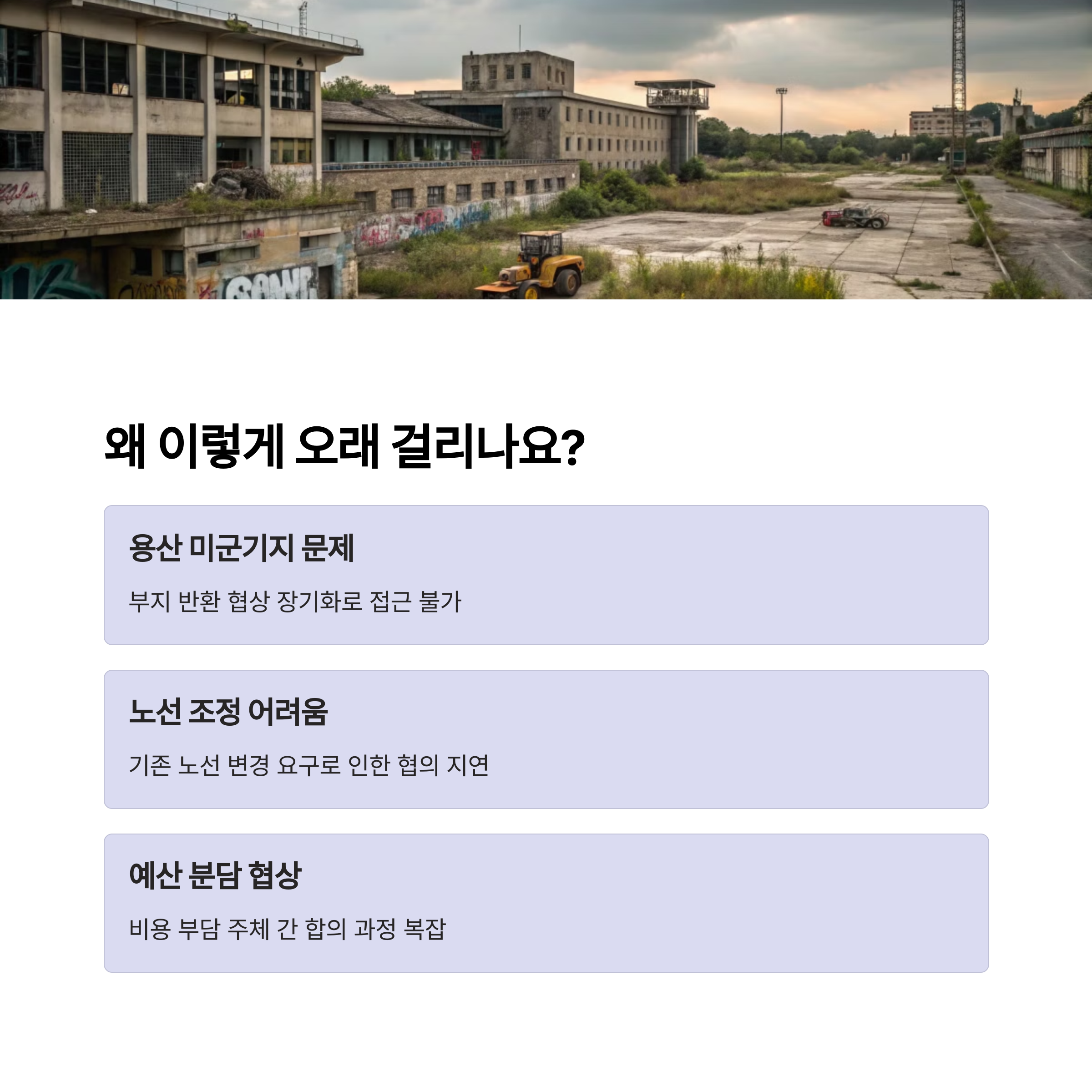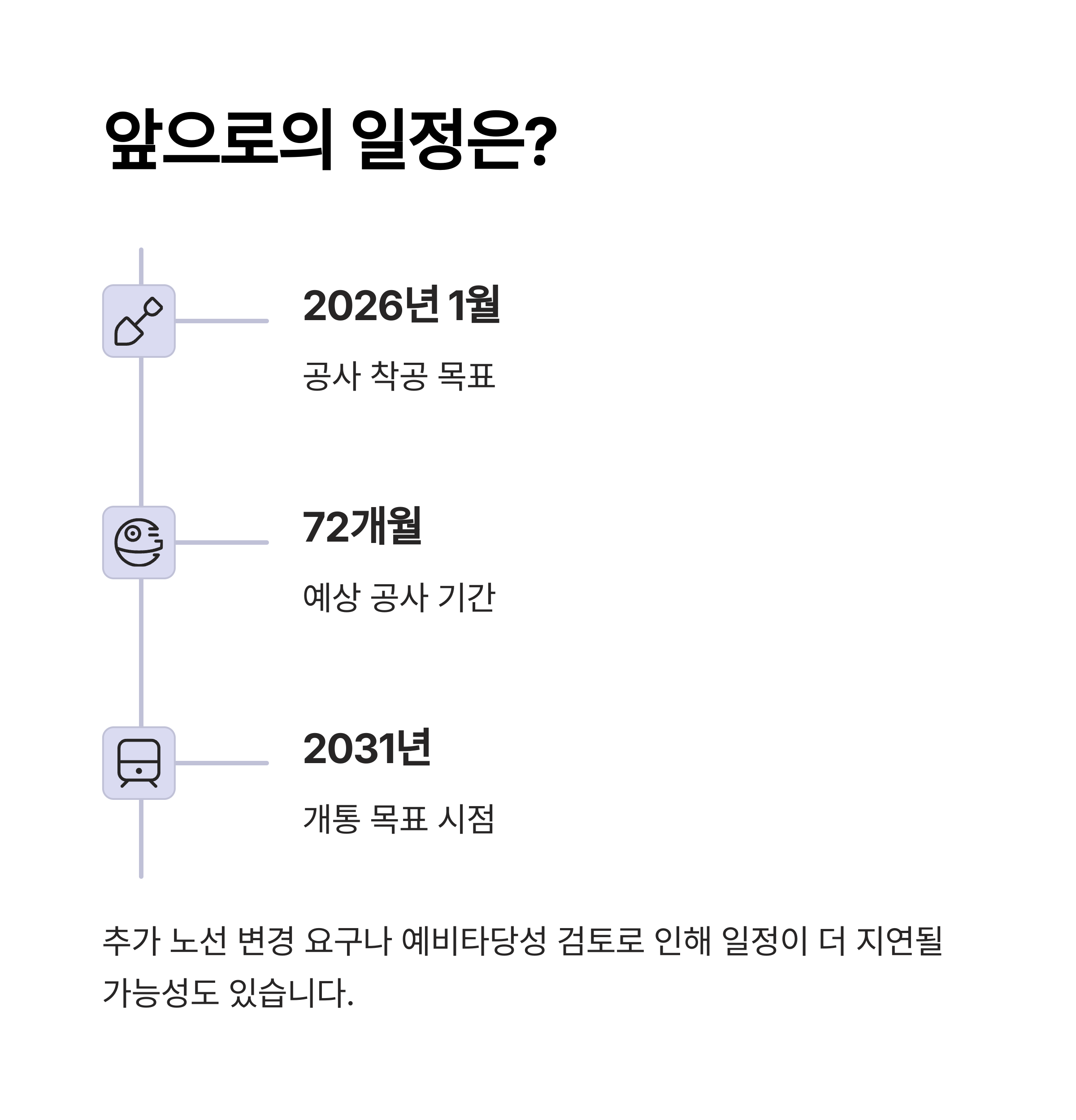 | 공사 지연 및 개통 시점도 2031년으로 조정 | 예타조사와 지역 협의 절차 중 | 군사·행정 이슈로 인해 지연 요소 |