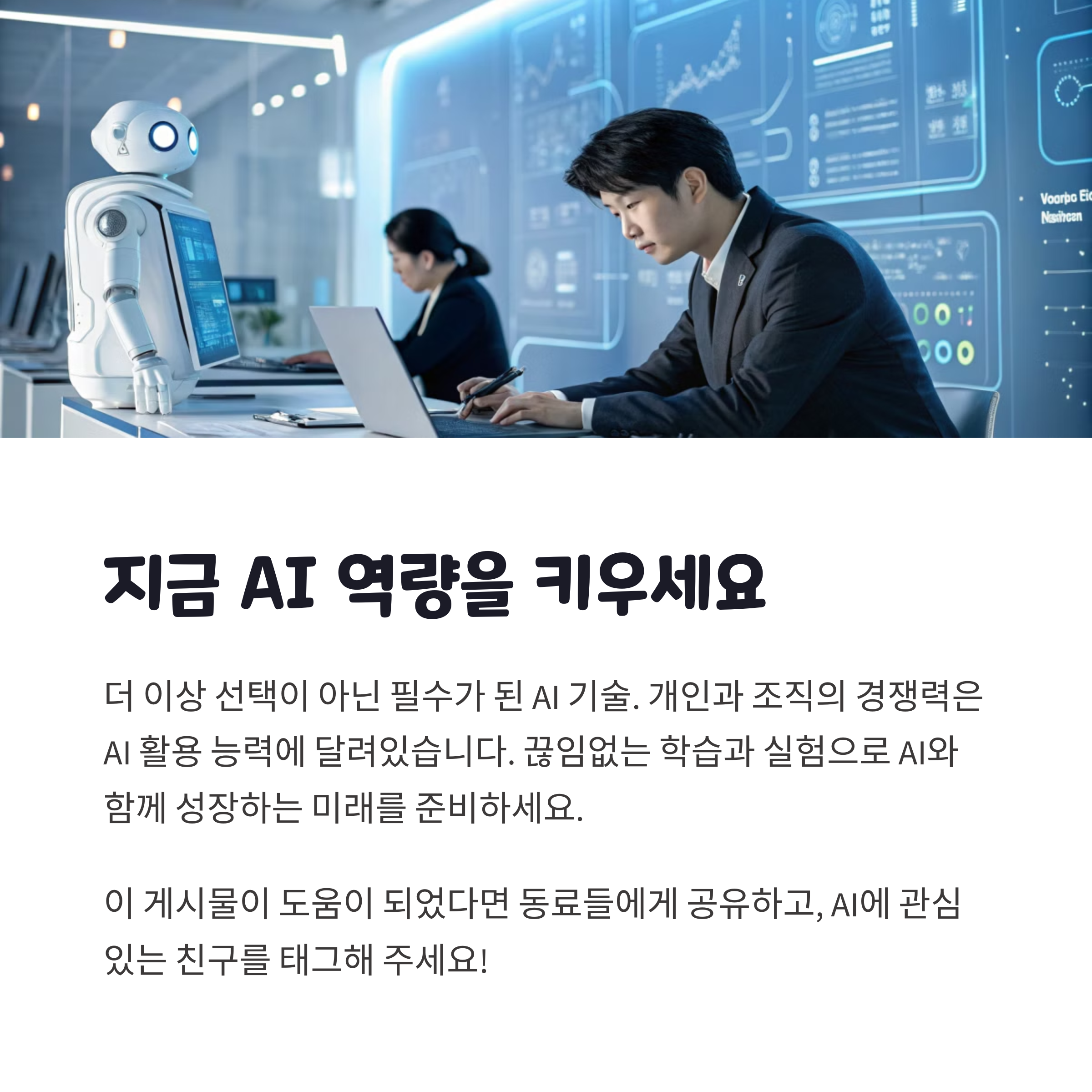 이제는 AI 도구를 단순한 실험용이 아닌, 업무의 핵심 파트너로 인식해야 할 때입니다. 특히 ChatGPT는 그 가능성이 무한하며, 사용하는 사람의 전략과 사고방식에 따라 결과물의 수준도 달라집니다. AI 겸임교수 권임의 강의는 그 점을 명확히 보여줍니다. ChatGPT를 잘 활용하는 사람은 단순한 기능을 넘어서, 사고 흐름과 논리, 결과물을 설계하는 능력을 지닌 사람입니다. 이 글을 통해 여러분도 AI와 함께하는 업무 혁신의 첫 걸음을 내딛어보시길 바랍니다.
