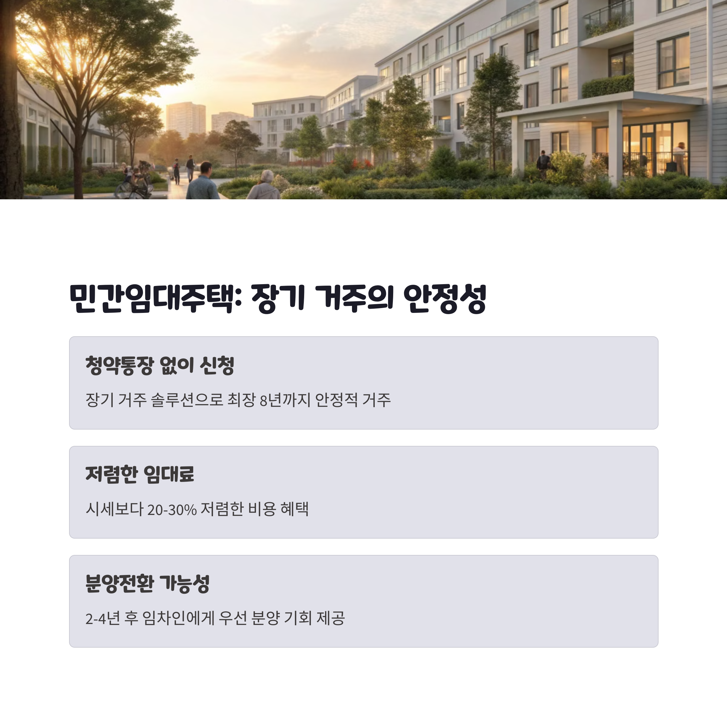 특히 최근에는 브랜드 건설사들이 공급하는 민간임대주택도 늘어나면서 품질과 시설 면에서도 만족도가 높아지고 있습니다. 실거주 목적의 무주택자라면 충분히 고려할 만한 선택지입니다.