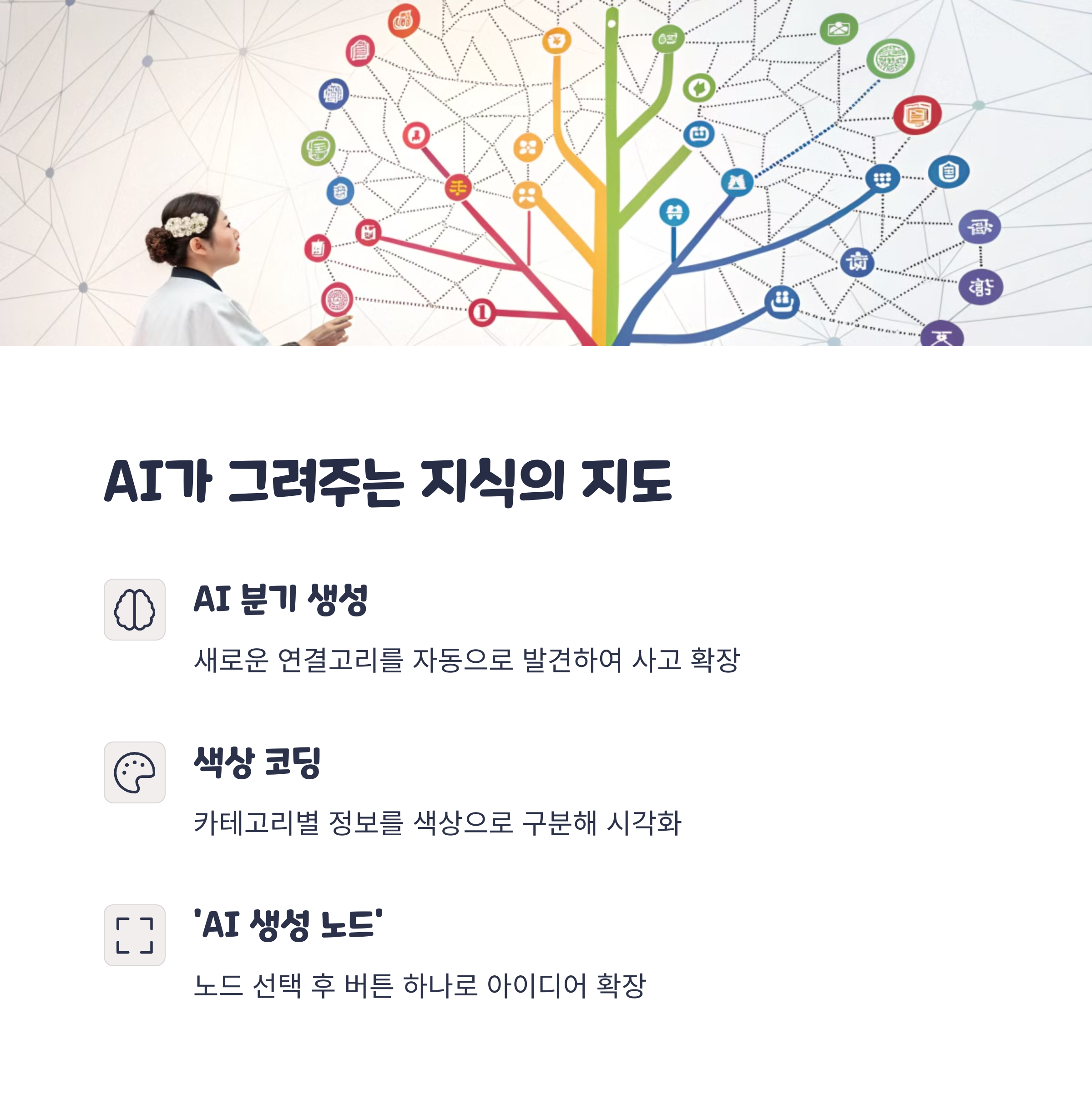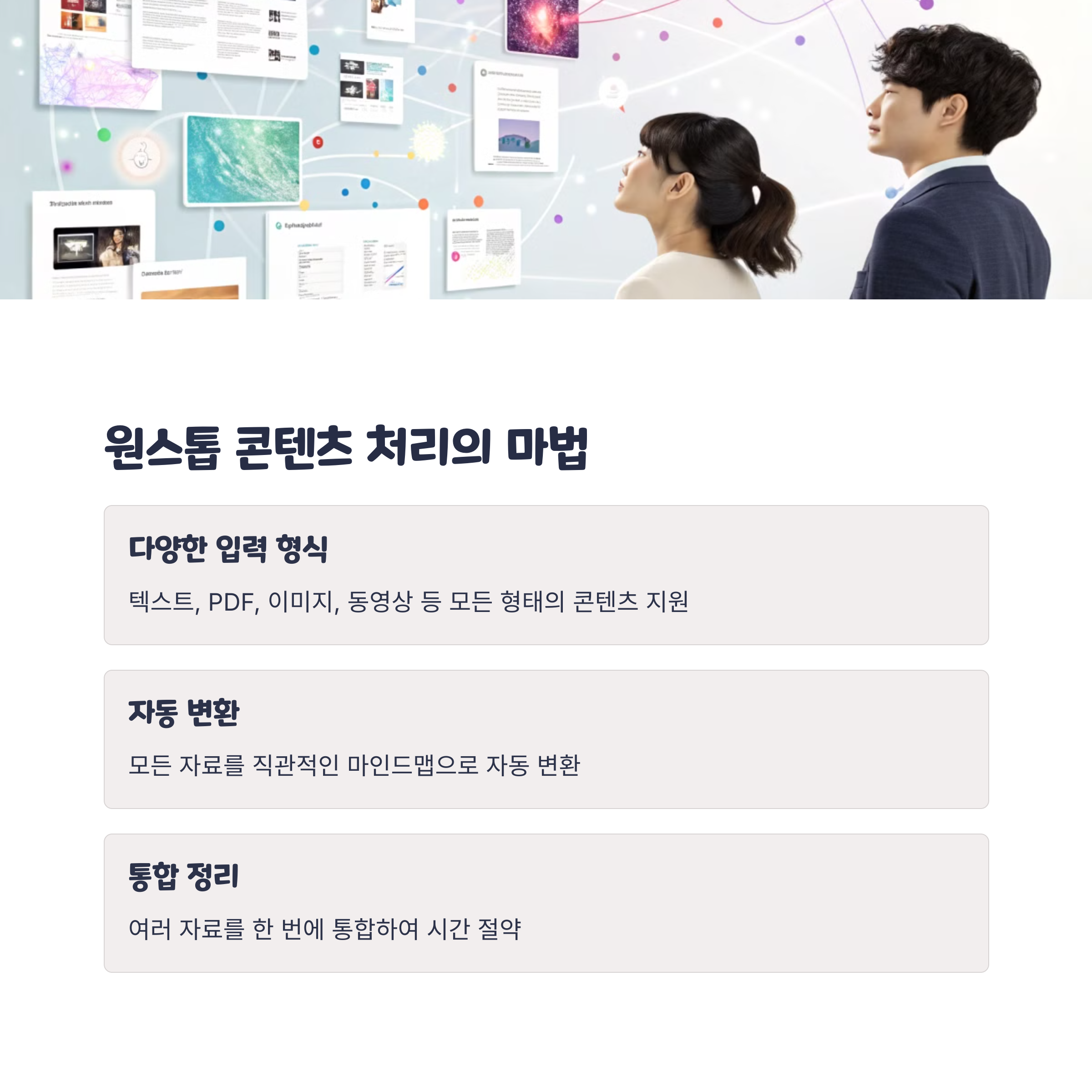 | 텍스트, PDF, 이미지, 영상 | 자동 요약 및 마인드맵 생성 | 학습 내용 정리, 회의록 시각화 |