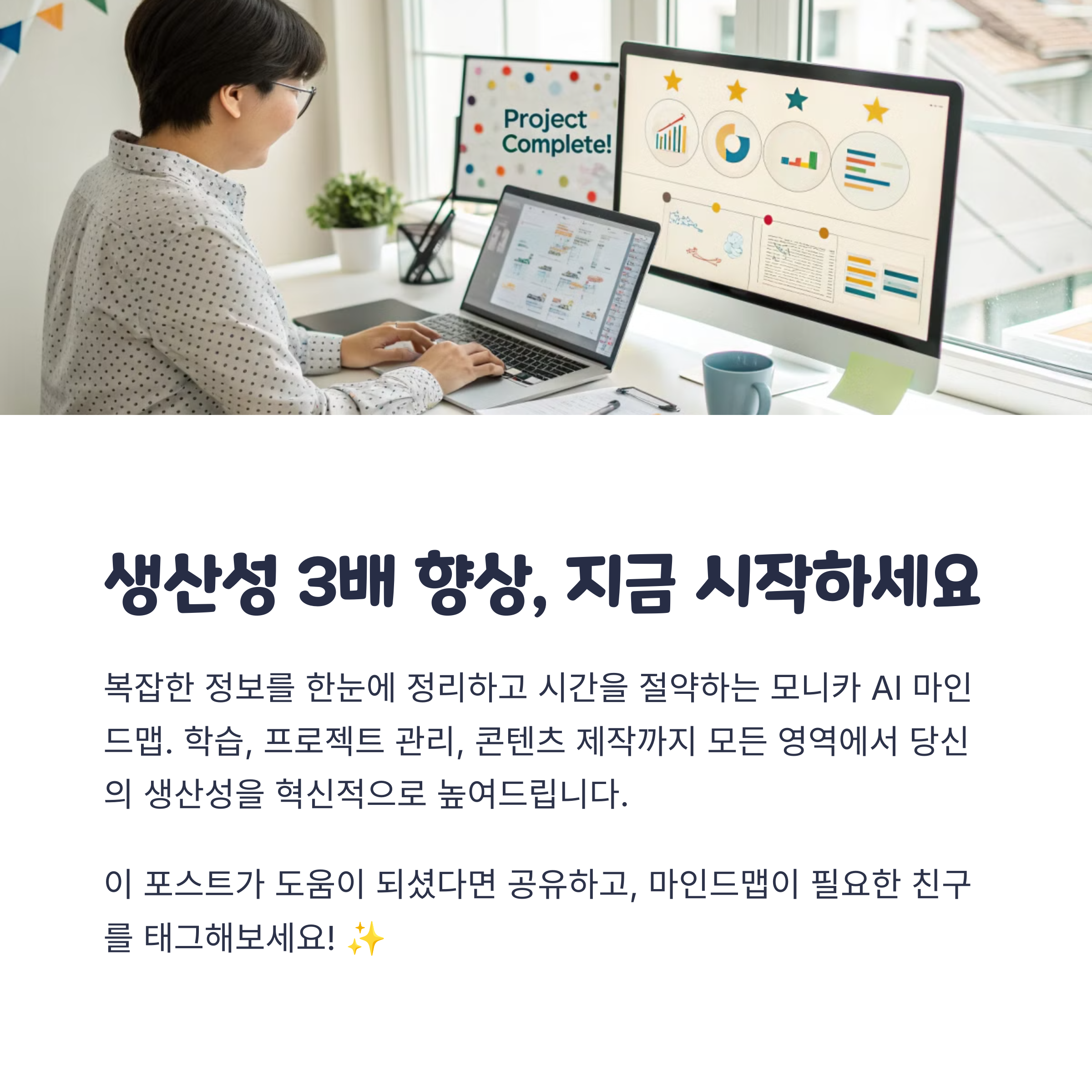 지금 모니카를 시작해보고, 정보 정리와 생산성을 동시에 높여보세요. 당신의 정리력이 3배 이상 향상될 수 있습니다!