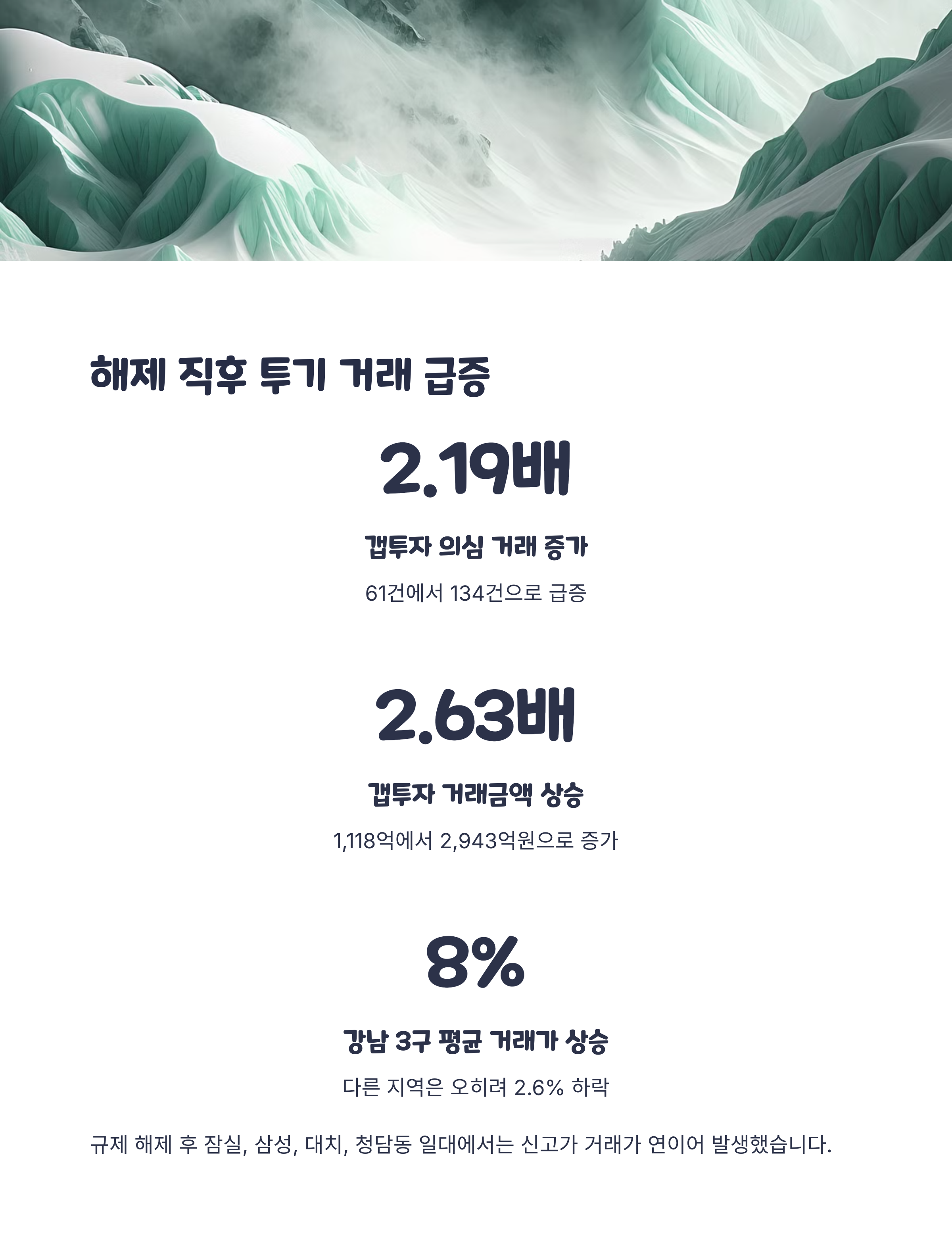 해제가 발표되자마자 갭투자 의심 거래가 급증했고, 아파트 매매 건수는 이전보다 두 배 이상 증가했습니다. 특히 강남권에서는 고가 아파트 거래가 활발하게 이뤄졌고, 전체 거래 금액도 눈에 띄게 올랐습니다.