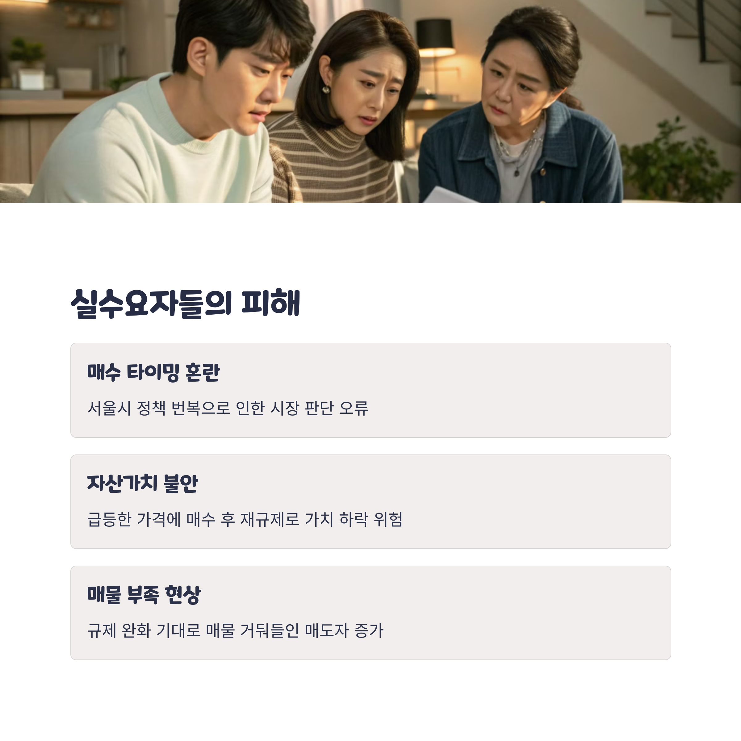 정책의 갑작스러운 변화는 투자자보다 일반 실수요자에게 더 큰 타격을 주곤 합니다. 단기간 안에 규제가 철회되면, 시장에 대한 신호가 왜곡되며 가격이 급등할 수 있고 이는 무주택자의 내 집 마련 부담으로 이어집니다.