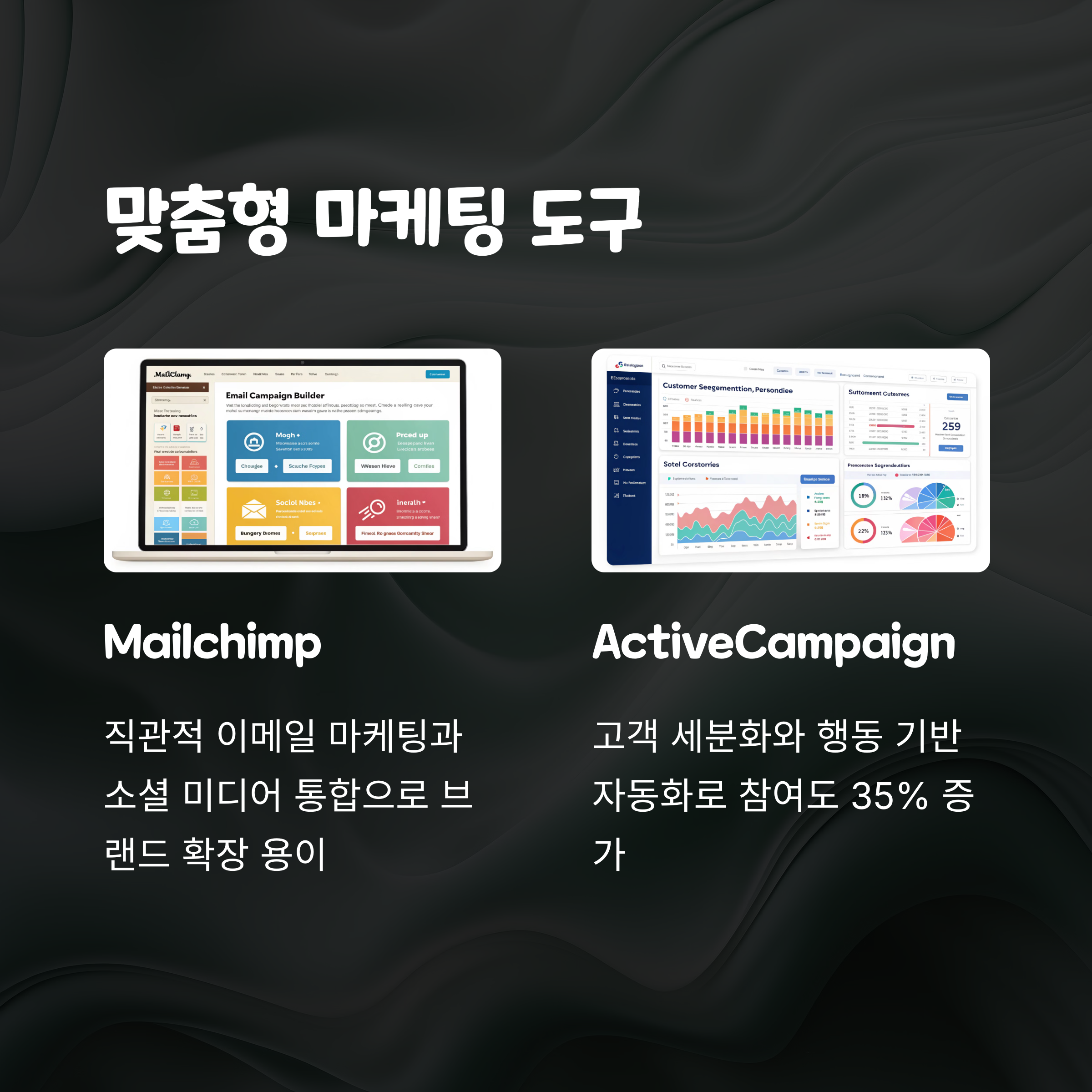 대표적인 마케팅 자동화 도구 중 하나인 HubSpot은 CRM과의 통합, 직관적인 인터페이스, 다양한 기능 지원으로 소기업에게 특히 유리한 플랫폼입니다. 또한 Mailchimp는 이메일 마케팅과 소셜 미디어 연동에 탁월하며, ActiveCampaign은 고객 데이터를 세분화하고 맞춤형 캠페인을 진행할 수 있어 고객의 반응률을 끌어올리는 데 효과적입니다. 각각의 플랫폼은 고유의 강점을 바탕으로 소기업의 다양한 니즈를 충족시켜줍니다.