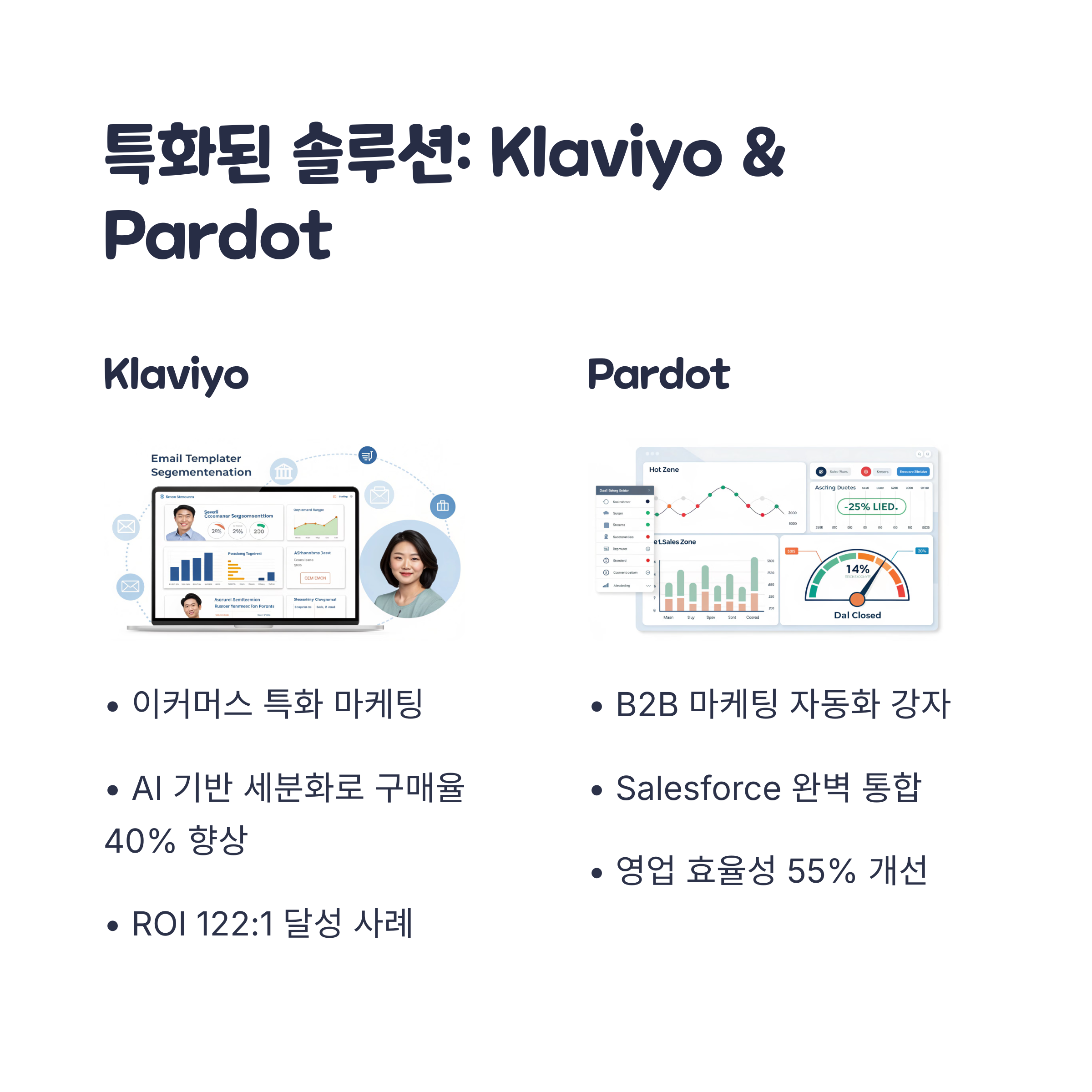 | 이메일, SMS, CRM 연동, 고급 워크플로우 설계 | 콘텐츠 마케팅, SEO, 소셜미디어 통합관리 | 이커머스 특화, 고급 세분화, AI 기반 추천 |