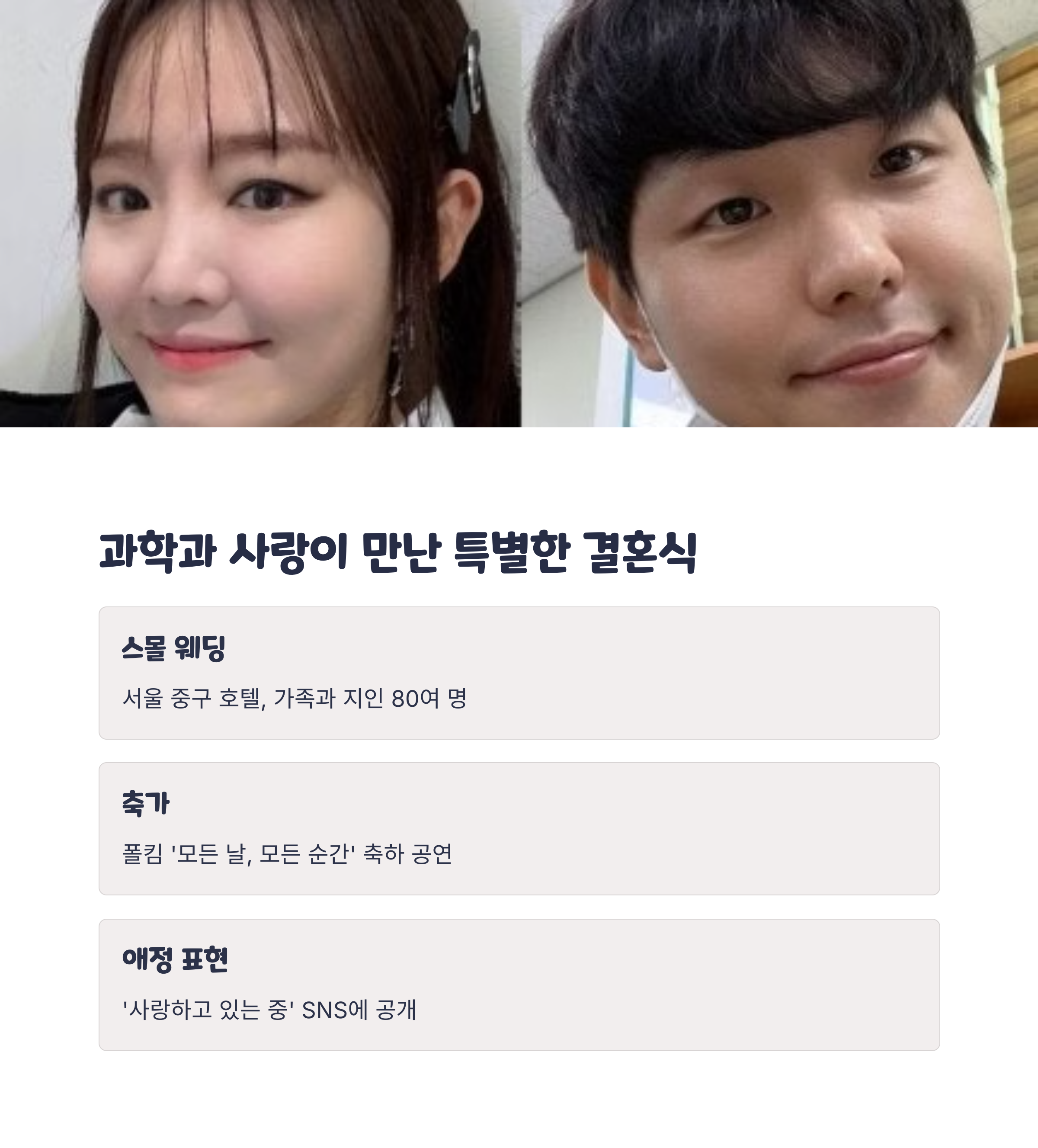 가수 윤하(37)와 과학 유튜버 과학쿠키(본명 이효종, 36)가 지난 3월 30일 서울 중구의 한 호텔에서 결혼식을 올렸습니다. 두 사람은 공통된 관심사인 과학을 매개로 가까워졌다고 알려졌습니다.