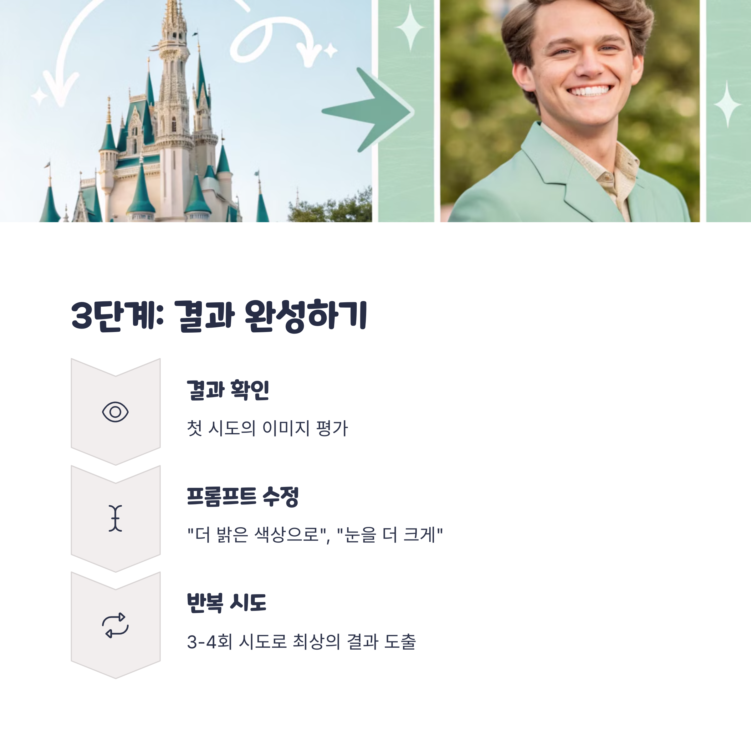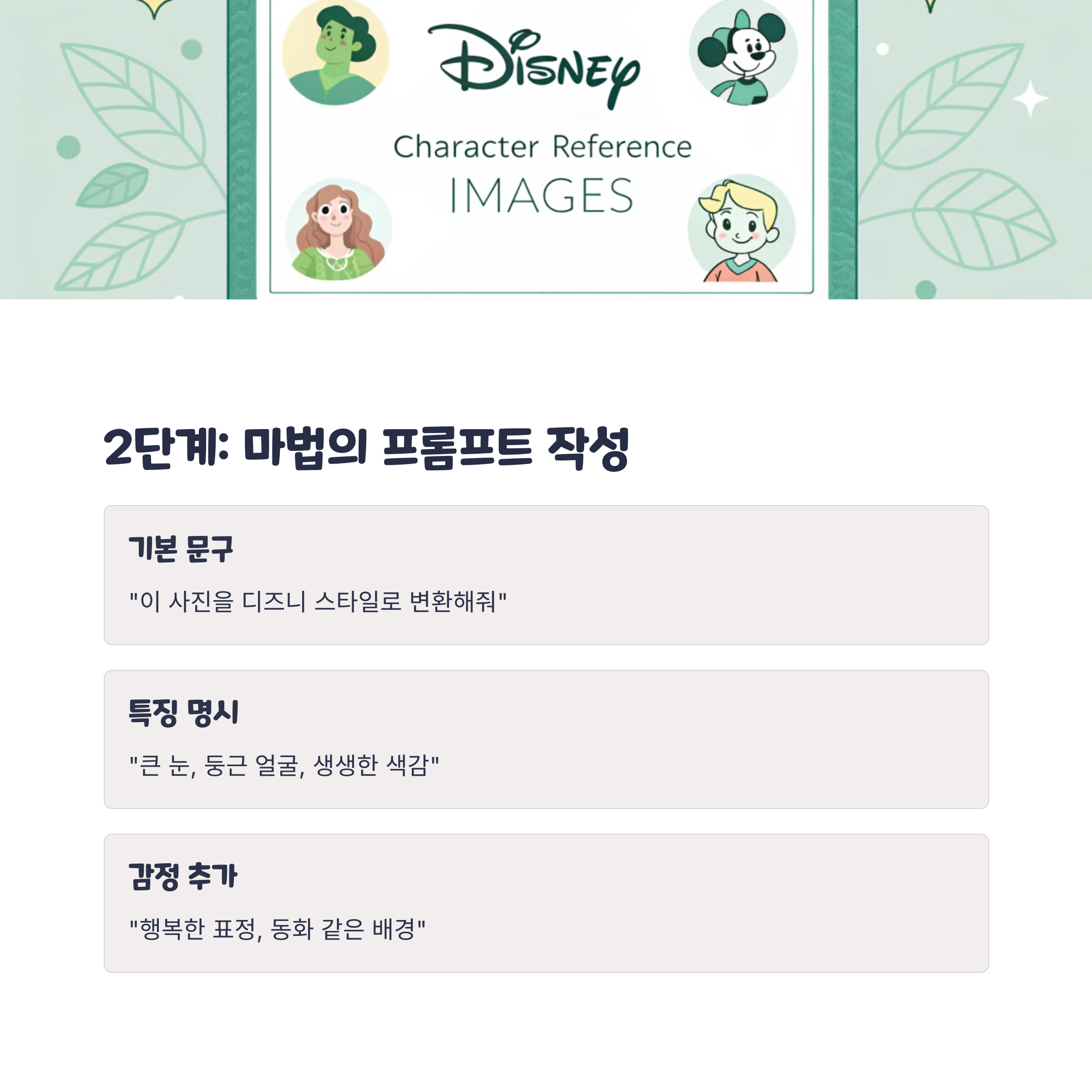 프롬프트는 단순히 "디즈니 스타일로 변환해줘"라고만 쓰는 것이 아니라, "큰 눈, 동글동글한 얼굴, 밝은 색감, 동화적 분위기" 등의 세부 디테일을 추가하는 것이 매우 중요합니다. 이러한 묘사들은 AI가 디즈니 특유의 감성을 포착하도록 도와주며, 더 만족스러운 결과를 이끌어낼 수 있습니다. 또한 원하는 결과가 아닐 경우에는 프롬프트를 수정하거나, 이전 결과를 참고하여 방향을 조정하는 것도 좋습니다.