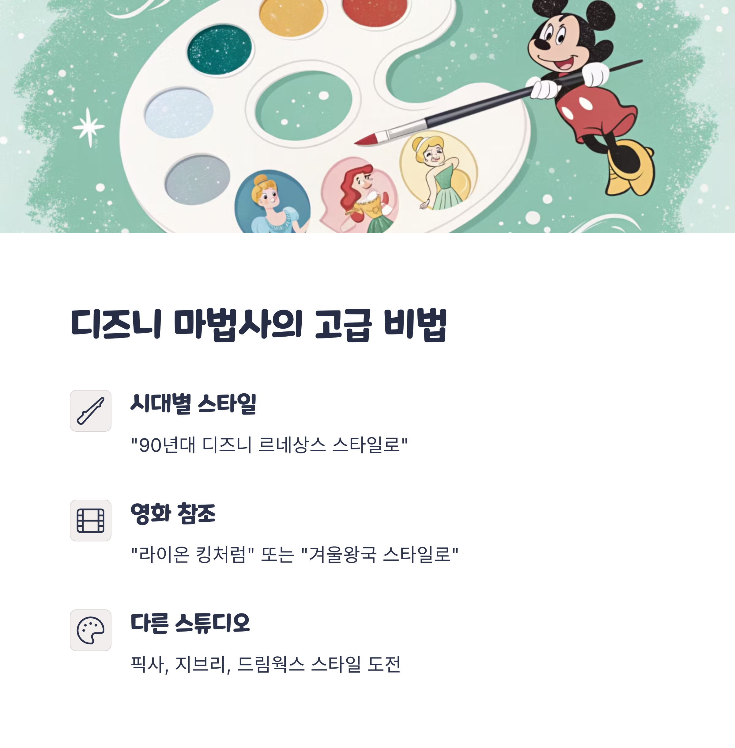 프롬프트는 단순히 "디즈니 스타일로 변환해줘"라고만 쓰는 것이 아니라, "큰 눈, 동글동글한 얼굴, 밝은 색감, 동화적 분위기" 등의 세부 디테일을 추가하는 것이 매우 중요합니다. 이러한 묘사들은 AI가 디즈니 특유의 감성을 포착하도록 도와주며, 더 만족스러운 결과를 이끌어낼 수 있습니다. 또한 원하는 결과가 아닐 경우에는 프롬프트를 수정하거나, 이전 결과를 참고하여 방향을 조정하는 것도 좋습니다.