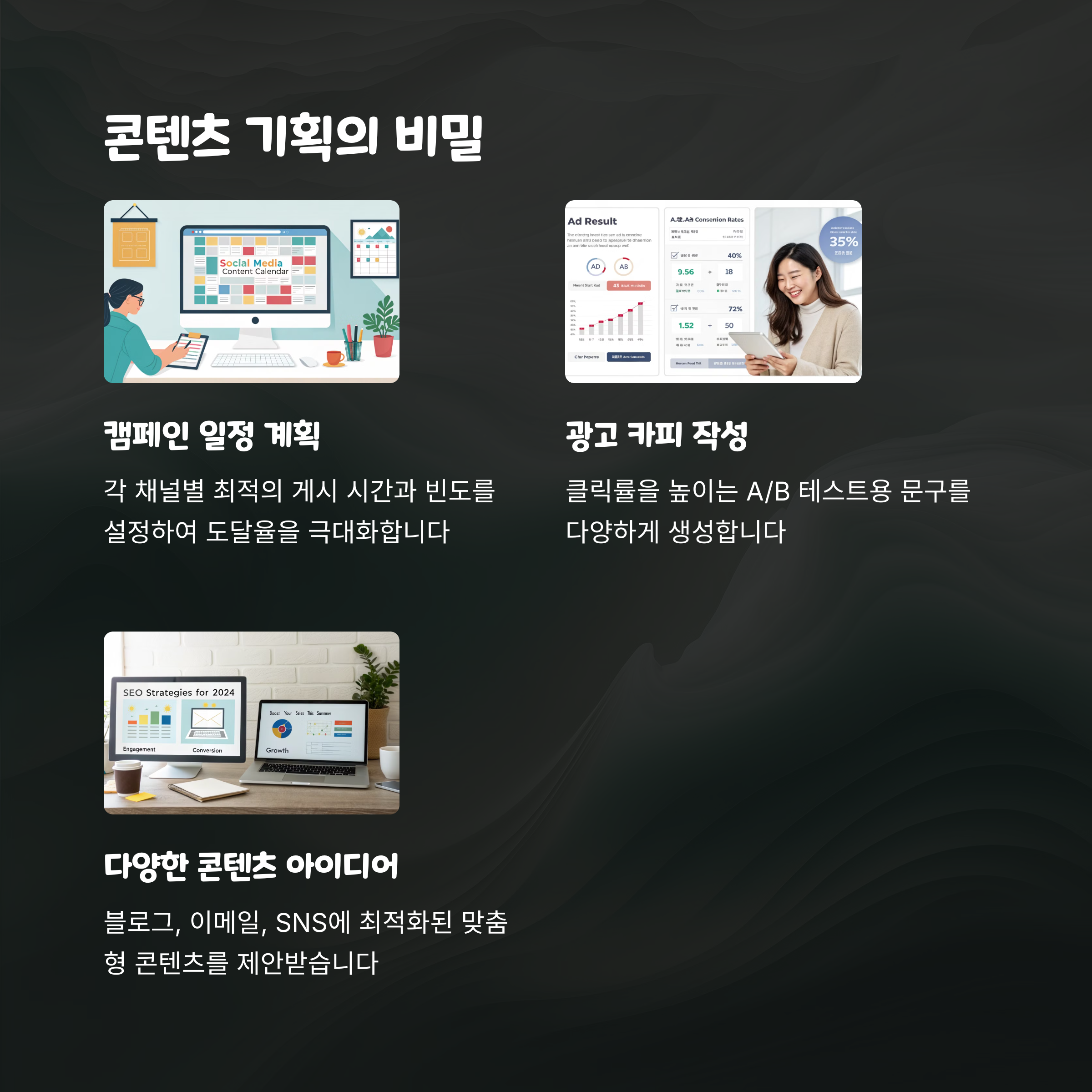 | 전략 방향성과 캠페인 설계 기반 마련 | 트렌드 반영한 문구 작성 및 A/B 테스트 활용 | 데이터 기반 성과 피드백으로 전략 조정 |