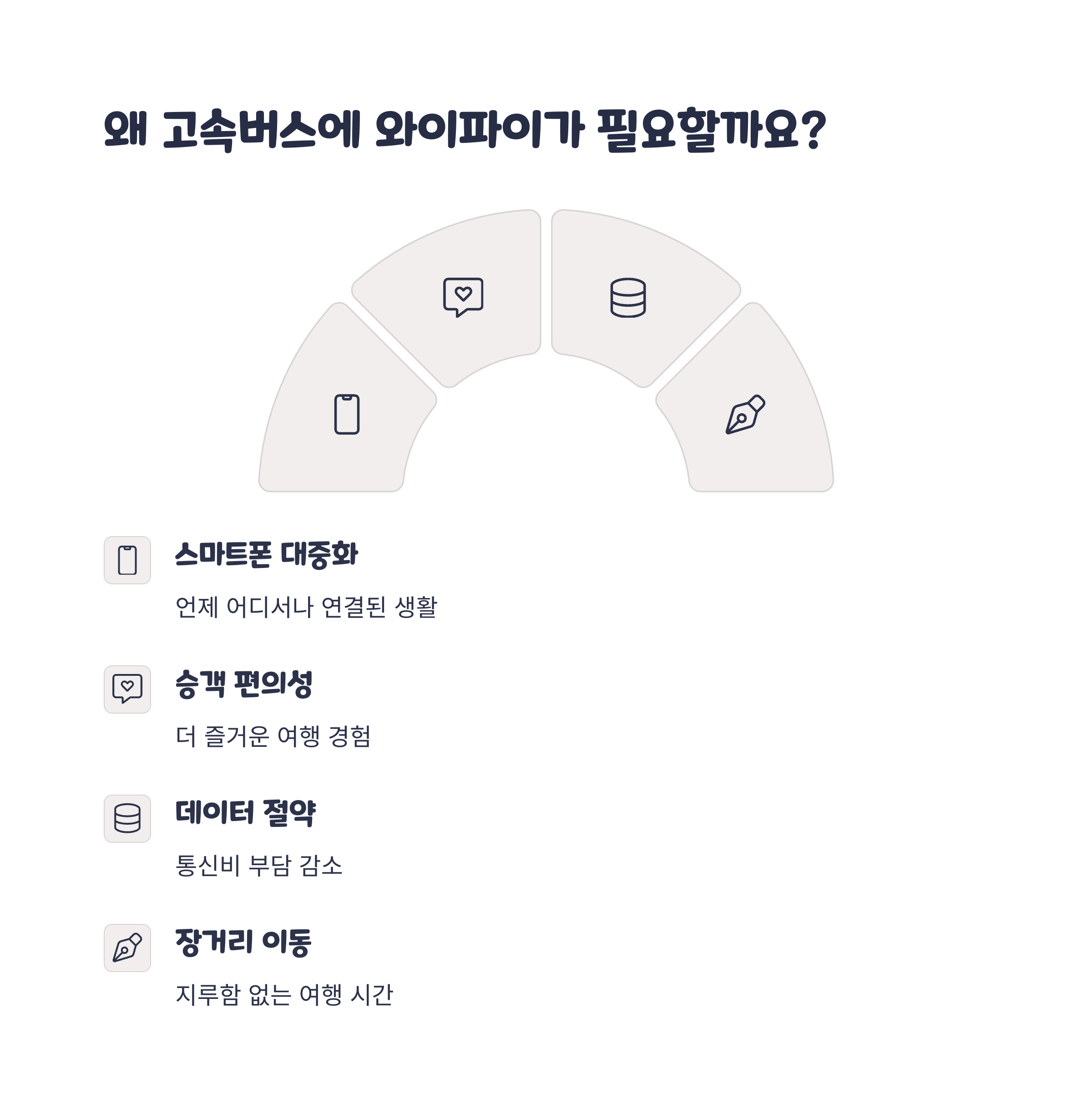스마트폰이 대중화된 지금, 고속버스에서의 스마트폰 활용 비율은 그 어느 때보다 높습니다. 그에 따라 고속도로를 이동하는 동안에도 스트리밍 영상 시청, 업무용 화상회의, 모바일 검색 등 데이터 사용량이 많은 행위들이 일반화되었습니다. 이러한 흐름 속에서 무료 와이파이 제공은 단순한 서비스 수준을 넘어서, 이용자들의 만족도를 높이고 장거리 이동시간을 더욱 알차게 만들어주는 정책으로 자리매김하고 있습니다.