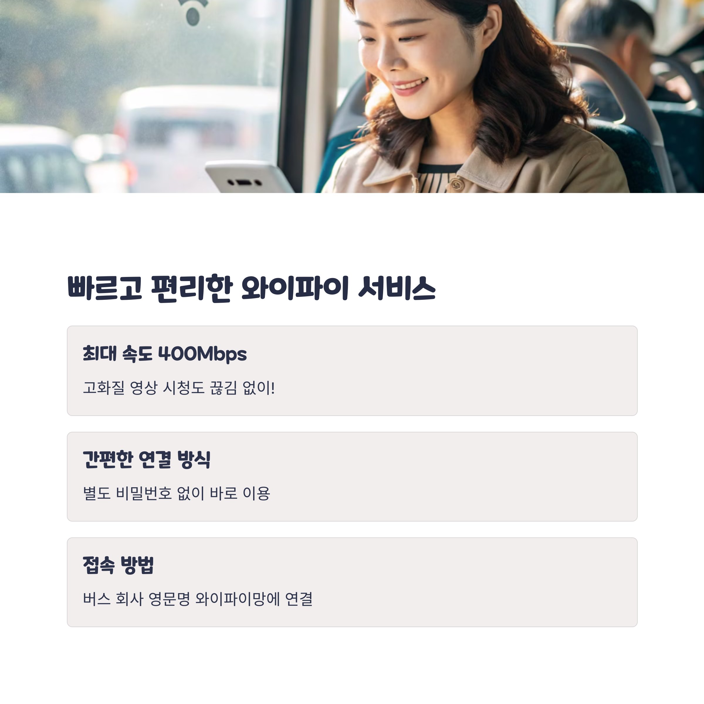 | 전국 1724대 고속버스에서 제공 | 안정적이고 빠른 400Mbps 속도 | 누구나 쉽게 접속 가능한 환경 |