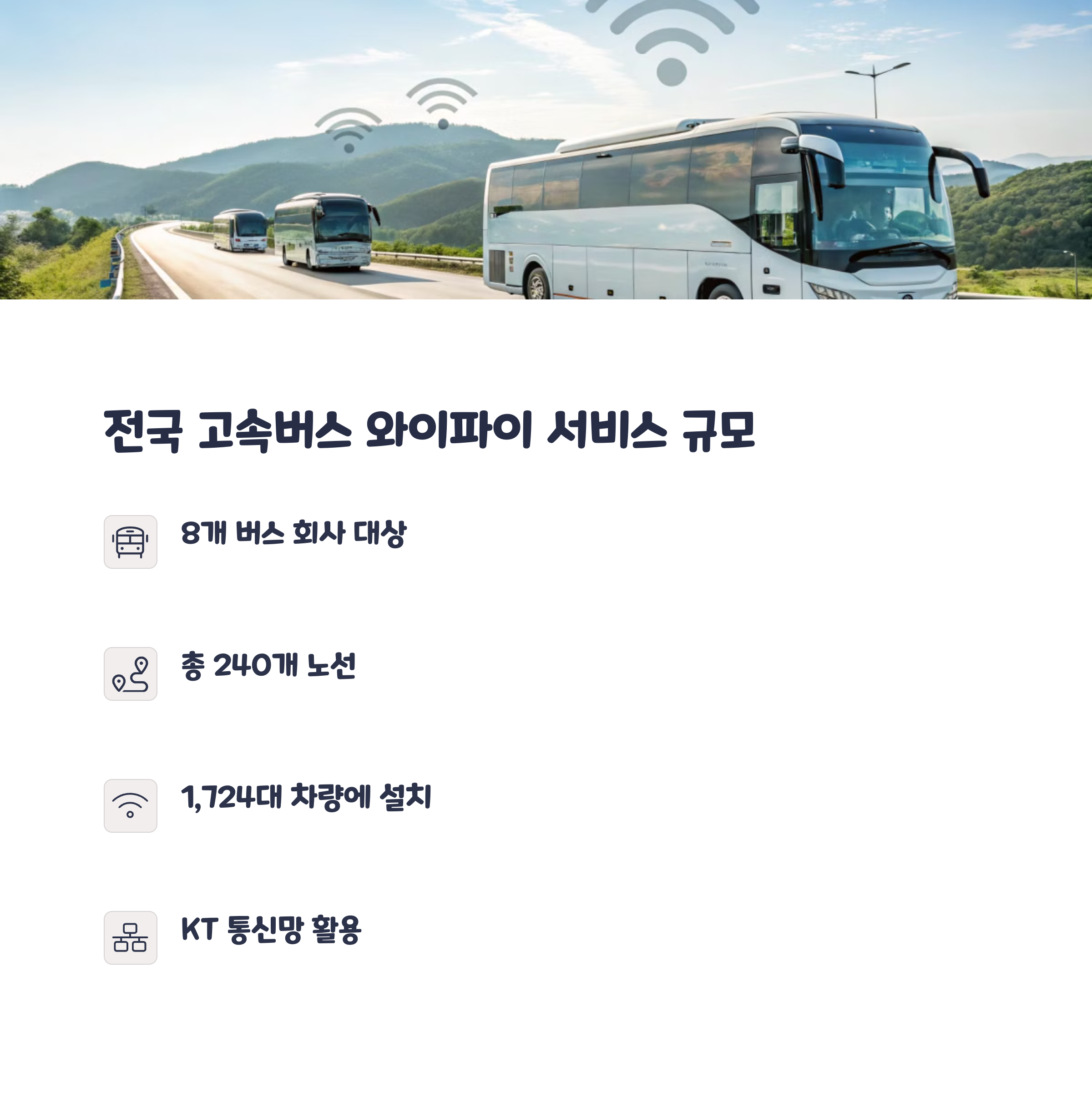 | 고속버스 무료 와이파이 | 전국 240개 노선, 1724대 차량에서 가능 |
