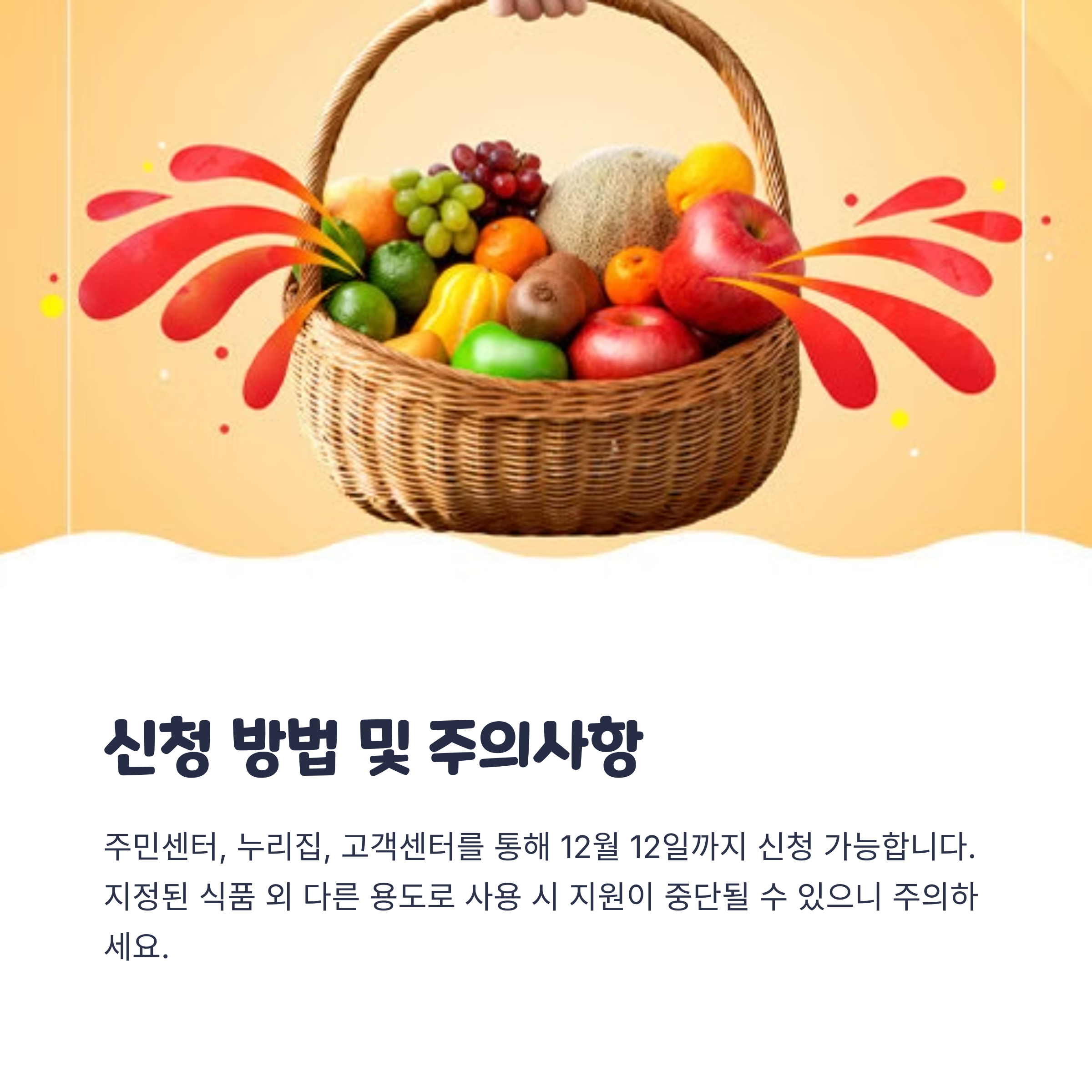 | 주민센터, 누리집, 고객센터 통해 접수 | 매월 충전 금액은 말일 자정 자동 소멸 | 식품 외 품목은 결제 불가, 현금화 금지 |