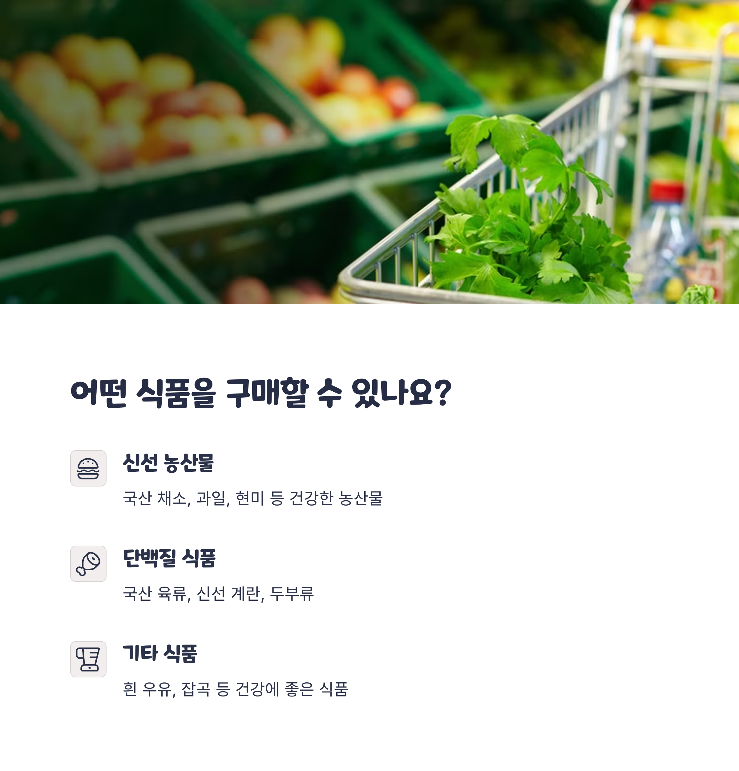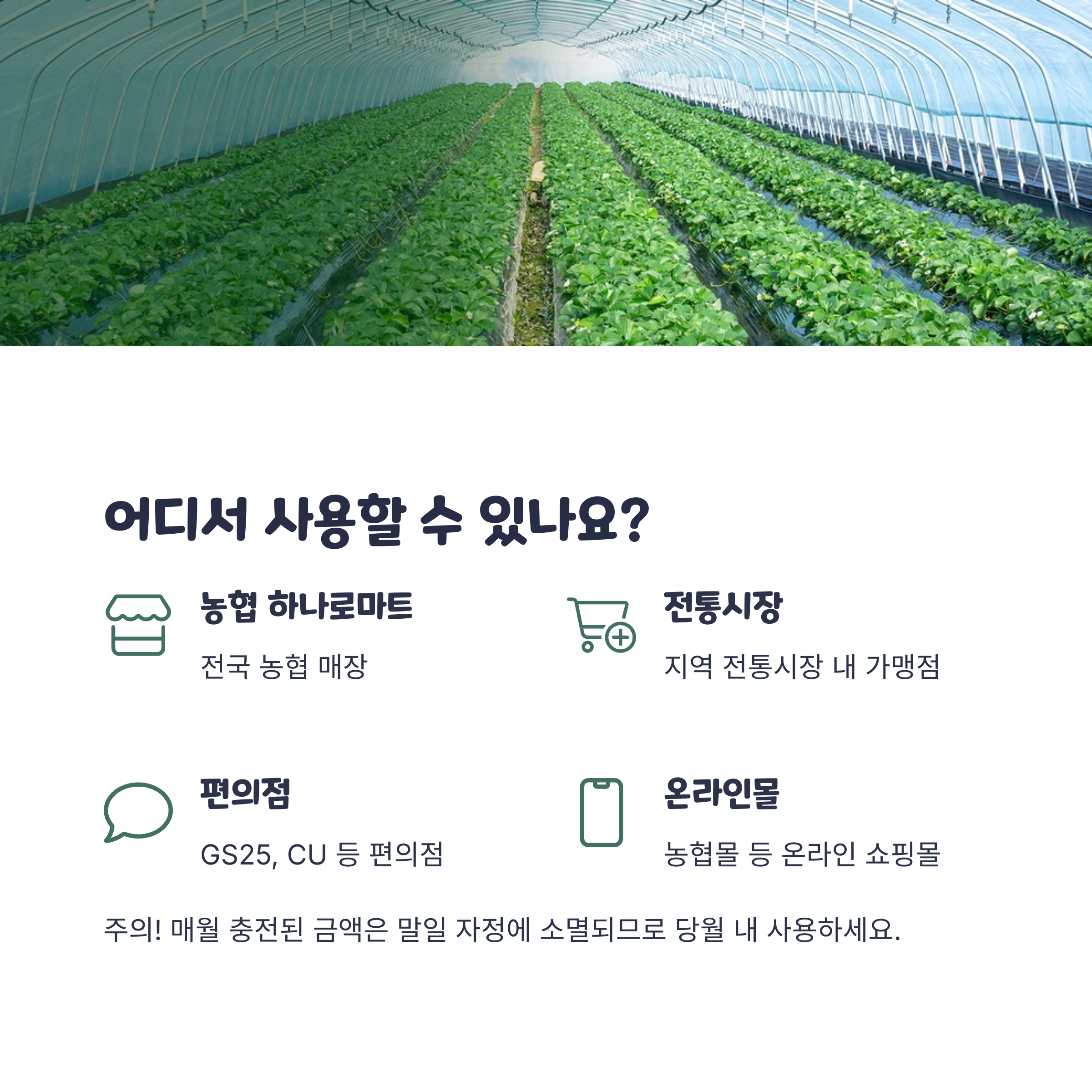 | 사용처 | 하나로마트, 전통시장, 편의점 등 식료품 구매 가능 |