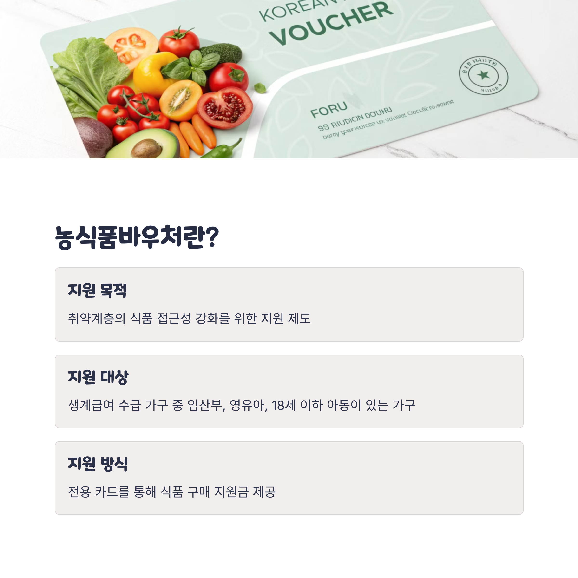 농식품바우처 제도는 정부가 저소득층의 건강한 식생활을 지원하기 위해 마련한 복지 정책입니다. 생계급여 수급 가구 중에서도 특히 임산부, 영유아, 18세 이하 아동이 포함된 가구를 대상으로 하며, 가구원 수에 따라 월 4만 원에서 최대 10만 원까지 바우처가 차등 지급됩니다. 해당 바우처는 식품 전용 카드로 지급되며, 농산물 중심의 건강한 먹거리 구입에 활용할 수 있도록 구성되어 있습니다.