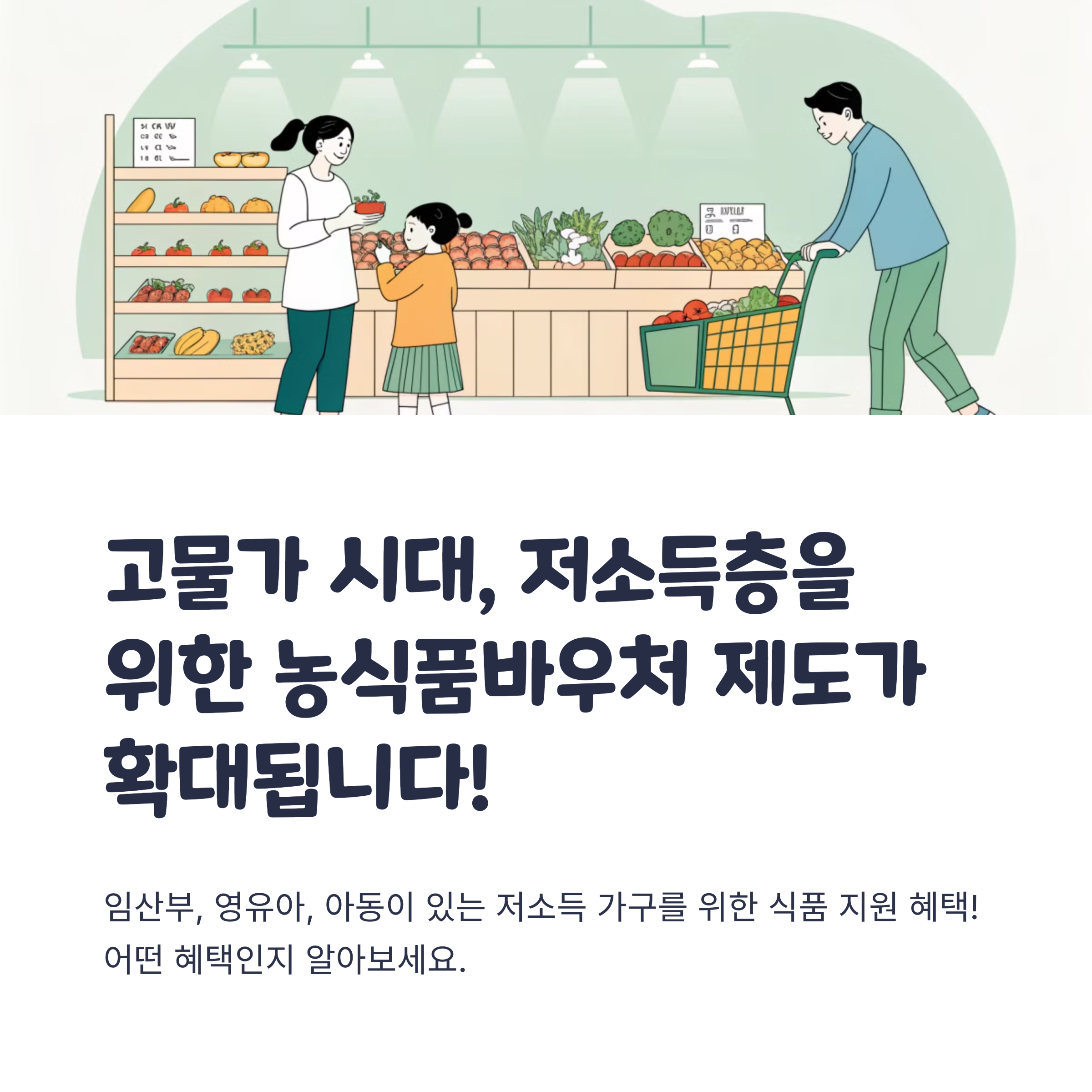 최근 고물가 상황이 지속되면서 저소득층의 식생활 부담이 커지고 있습니다. 이에 정부는 전국적으로 농식품바우처 제도를 확대 시행하여 생계에 어려움을 겪는 국민들의 건강한 식생활을 지원합니다. 특히 임산부, 영유아, 아동이 있는 가구를 중심으로 실질적인 혜택이 주어지는 만큼 관련 정보를 꼼꼼히 챙겨두는 것이 좋습니다. 이번 글에서는 농식품바우처 신청 방법, 지원 금액, 사용처, 사용 시 주의사항까지 한눈에 확인하실 수 있도록 자세히 안내드리겠습니다. 놓치면 아쉬운 혜택인 만큼 꼭 끝까지 읽어보시고 소중한 가족의 건강을 챙기시기 바랍니다.
