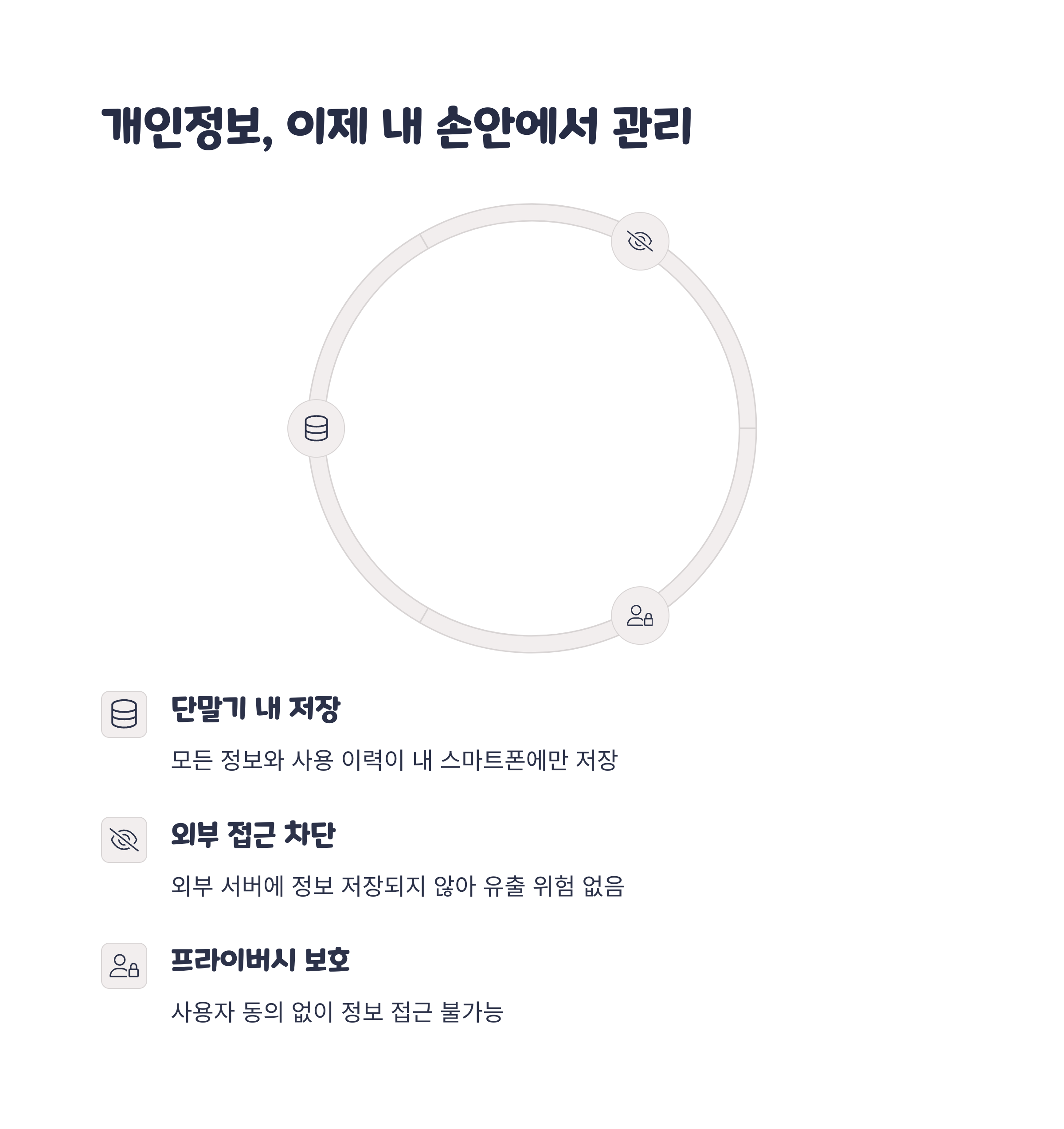 개인정보 및 사용 이력은 스마트폰 내부에만 저장되며, 중앙 서버에는 기록되지 않아 사생활 보호에 유리합니다.