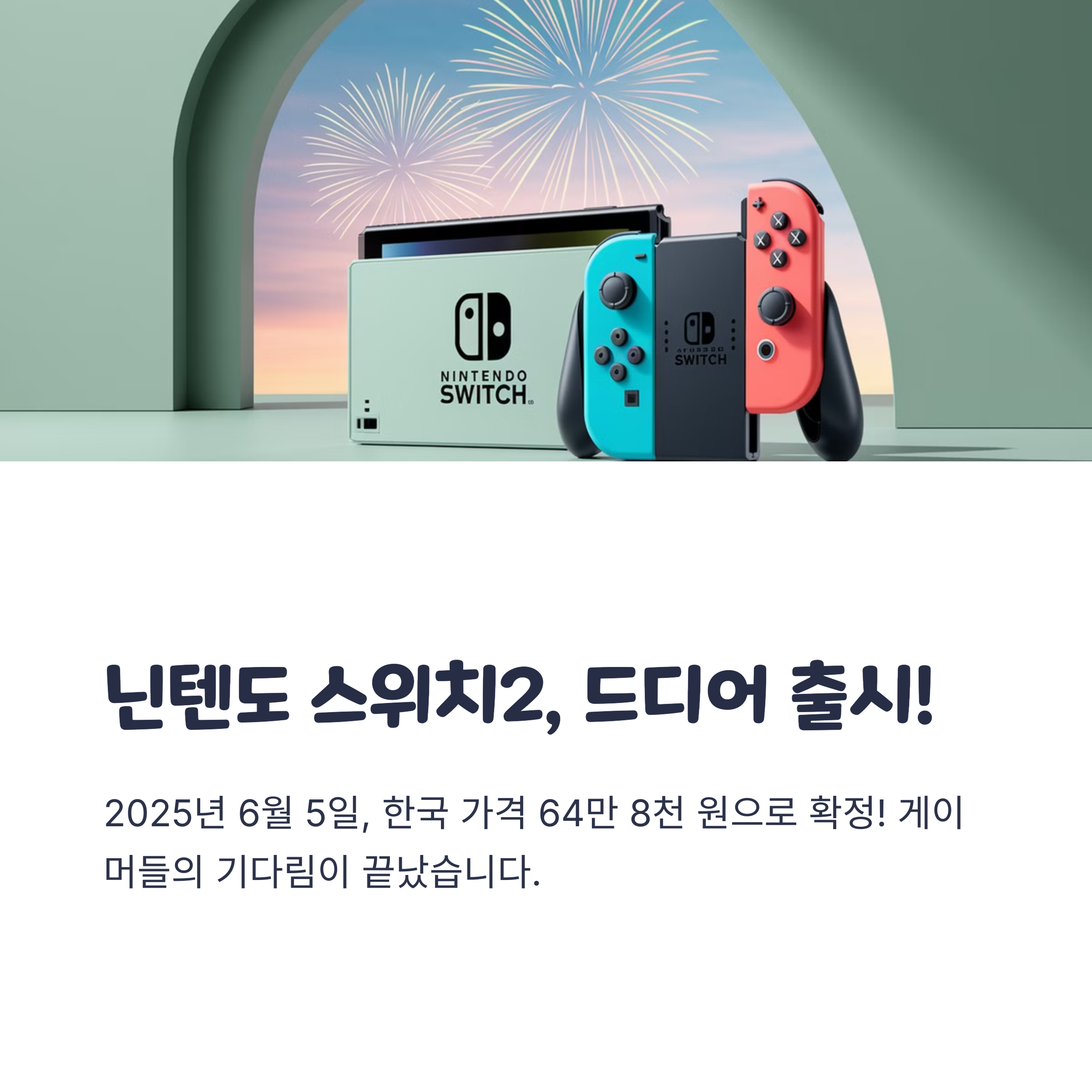 닌텐도 스위치2는 2025년 6월 5일에 정식 출시됩니다. 전작보다 성능과 디스플레이가 크게 향상되어 많은 기대를 모으고 있습니다.