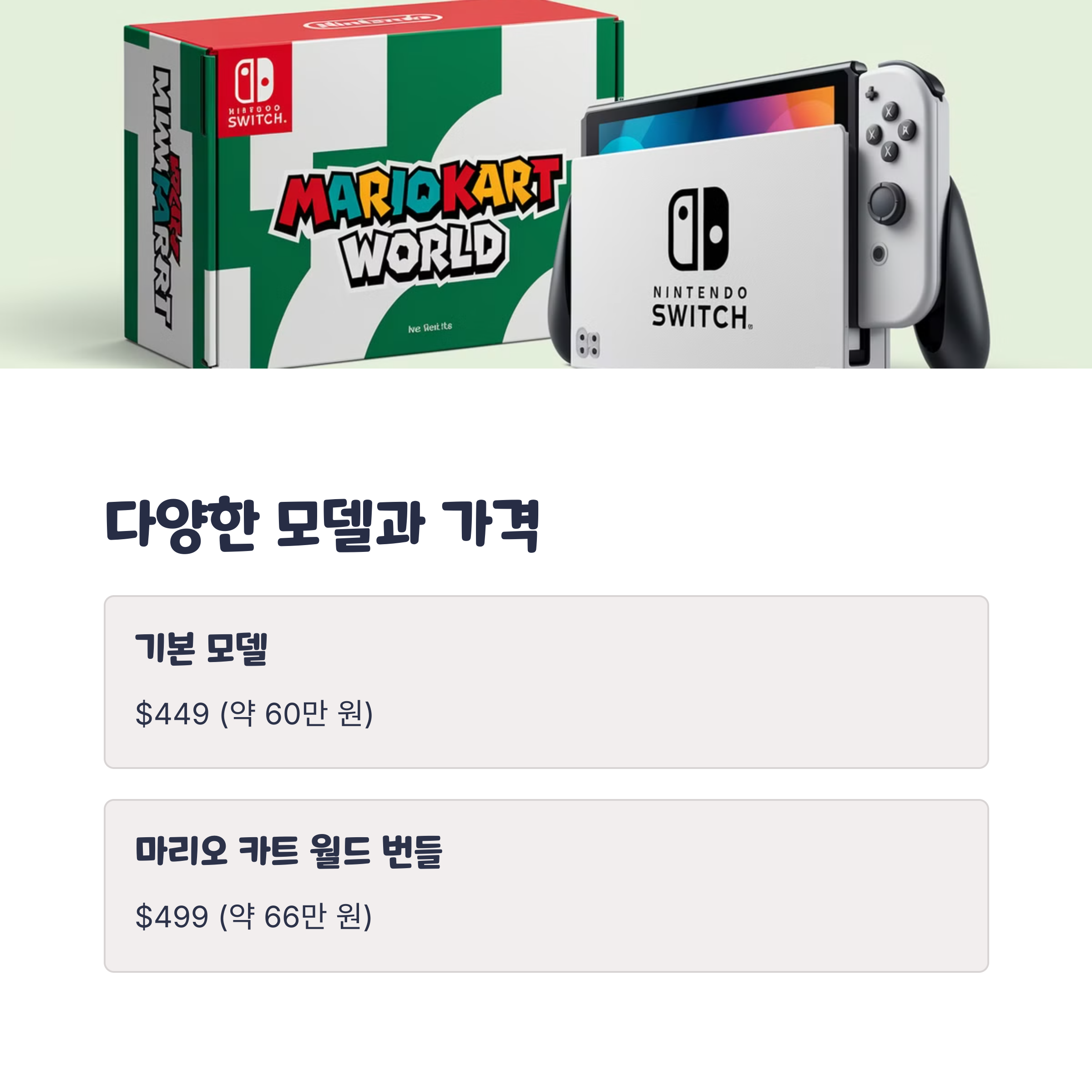 한국 출시가는 648,000원으로 확정되었으며, 미국 기준 기본 모델은 $449, 마리오 카트 번들은 $499에 판매됩니다.