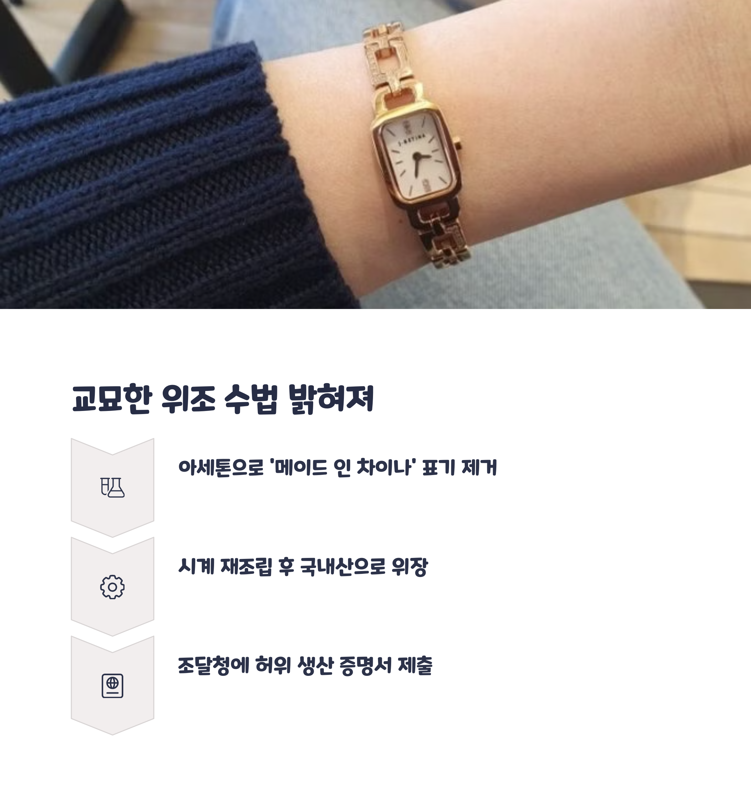 제이에스티나는 중국 제조 업체에서 시계를 들여온 뒤, 제품에서 'Made in China' 라벨을 아세톤으로 제거했습니다. 이후 일부 부품을 바꿔 끼우는 방식으로 시계를 다시 조립하고, 이를 국산 제품인 것처럼 포장해 소비자들에게 판매했습니다. 외관상 문제없이 보이지만, 이는 명백한 소비자 기만 행위였습니다.