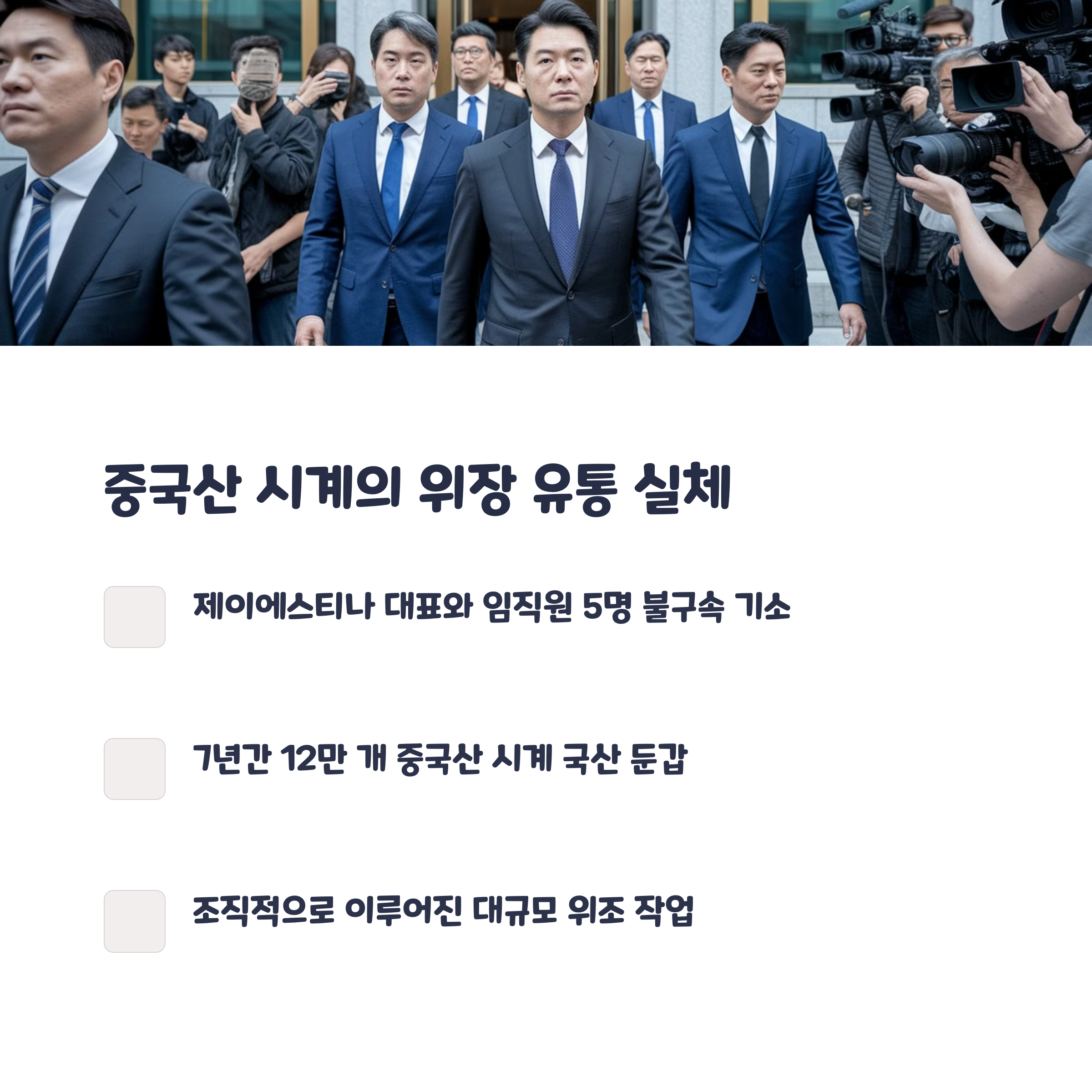 2017년부터 2023년까지, 제이에스티나의 김유미 대표와 영업부장 등 임직원들은 중국에서 손목시계 약 12만 개를 저렴하게 수입했습니다. 이들은 시계에 부착된 '메이드 인 차이나' 표기를 아세톤으로 제거한 후, 시계를 재조립하여 국산으로 둔갑시켰습니다. 이러한 방식으로 소비자들에게 판매된 시계의 총액은 약 60억 원에 달합니다.
