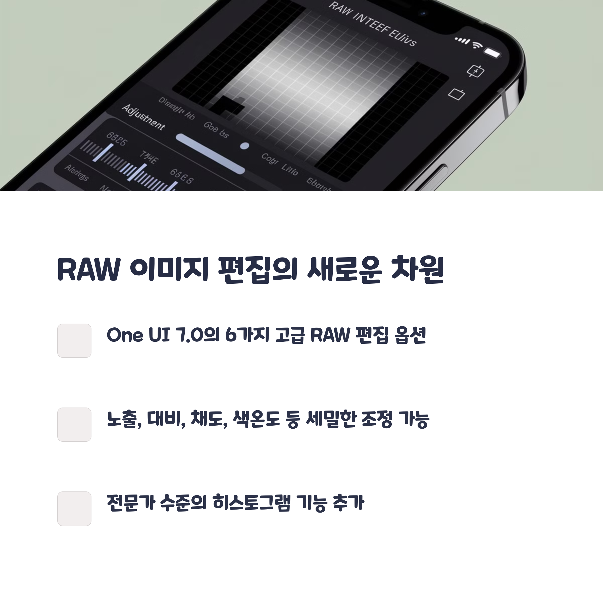 갤럭시 S25 울트라의 RAW 편집은 사진의 세부 요소를 직접 조정할 수 있는 기능입니다. One UI 7.0에서는 노출, 대비, 채도, 색온도, 노이즈 제거 등 총 6가지 조절 옵션을 제공합니다.
